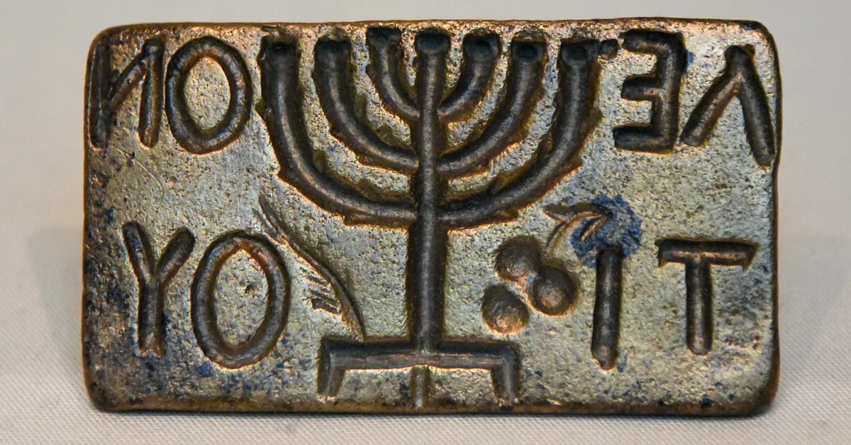 In the Late Roman Period, the Jewish faith was expressed through symbols of personal items in much the same way as for Christianity. The Jewish "Menorah" is depicted on this bread-stamp. The stamp bears the name of "Leontios", which perhaps was designed to indicate that the bread was kosher. 200s to 500s CE. From Sardis, Lydia, modern-day Turkey. (The British Museum, London).