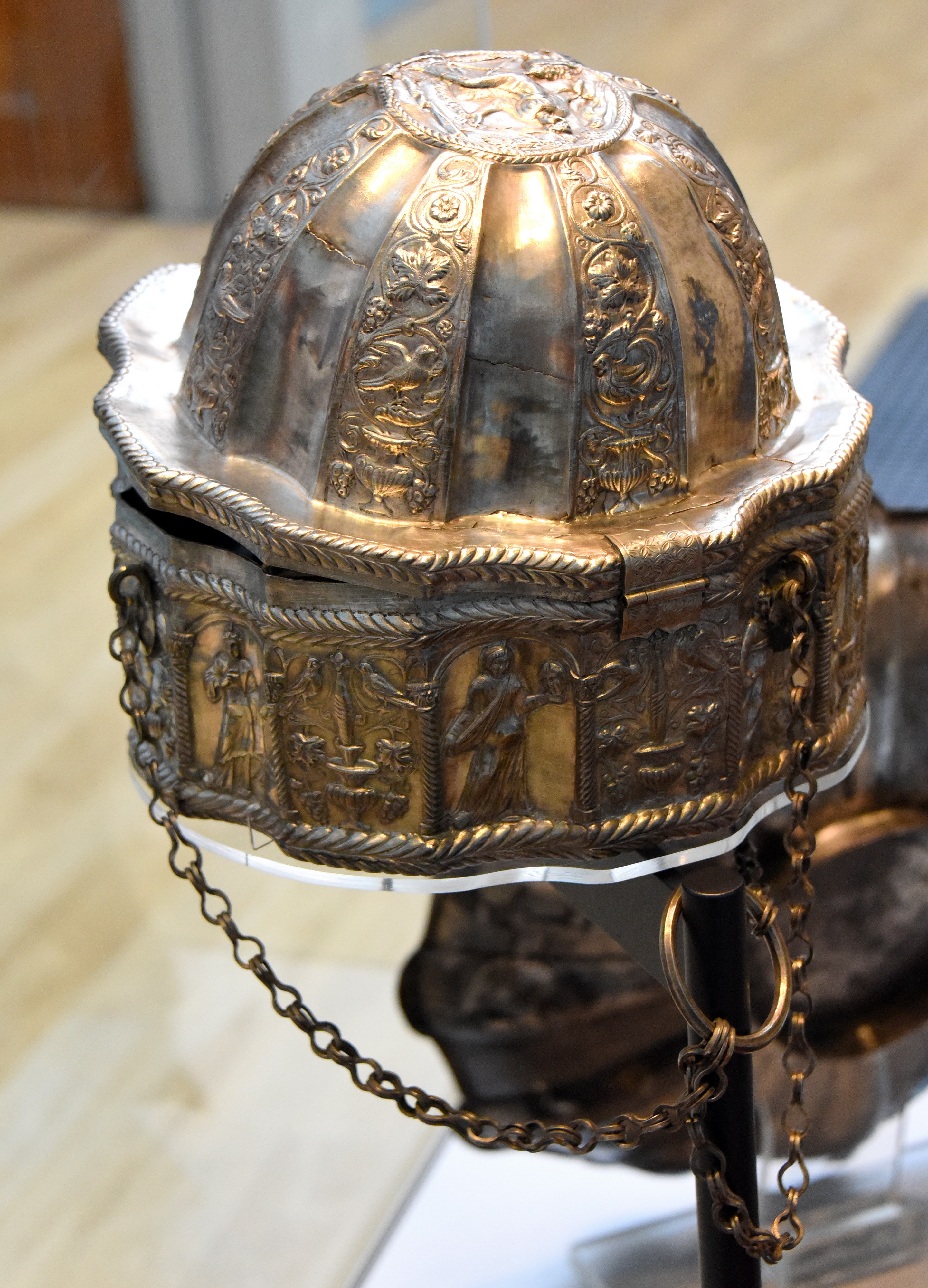 This elaborate cosmetics box, suspended on three chains, holds five small canisters for perfumes and unguents. The outside is decorated with images of eight of the nine classical Muses. A 9th figure on the top of the casket may be the final Muse, but she lacks any identifying object or the feathered headdress worn by the others. Instead, she may be the portrait of the casket's owner. The images of the Muses would have flattered the casket's owner by emphasizing her knowledge of classical arts, which continued to be the height of educated sophistication among the Christian elite during the Late Roman Period. Part of the Esquiline Treasure, which was discovered in the year 1793 CE, at the foot of the Esquiline Hill, Rome, Italy. Circa 330-370 CE. From Rome. (The British Museum, London).