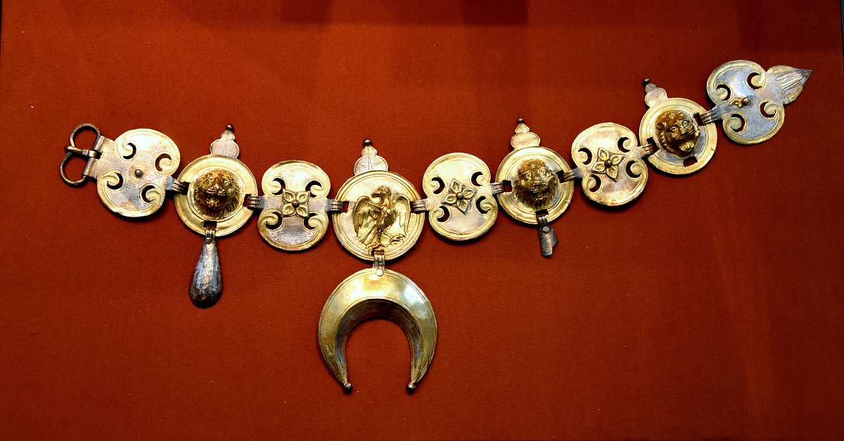 These gilded silver ornaments were strung around the neck of horses owned by aristocratic Roman families, as a way of displaying wealth and prestige. Four complete and two partial sets were found within the Esquiline Treasure. They are the finest and best-preserved examples known from the Late Roman World. Part of the Esquiline Treasure, which was discovered in the year 1793 CE, at the foot of the Esquiline Hill, Rome, Italy. 300s CE. From Rome. (The British Museum, London).