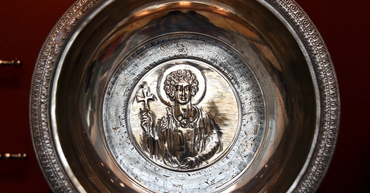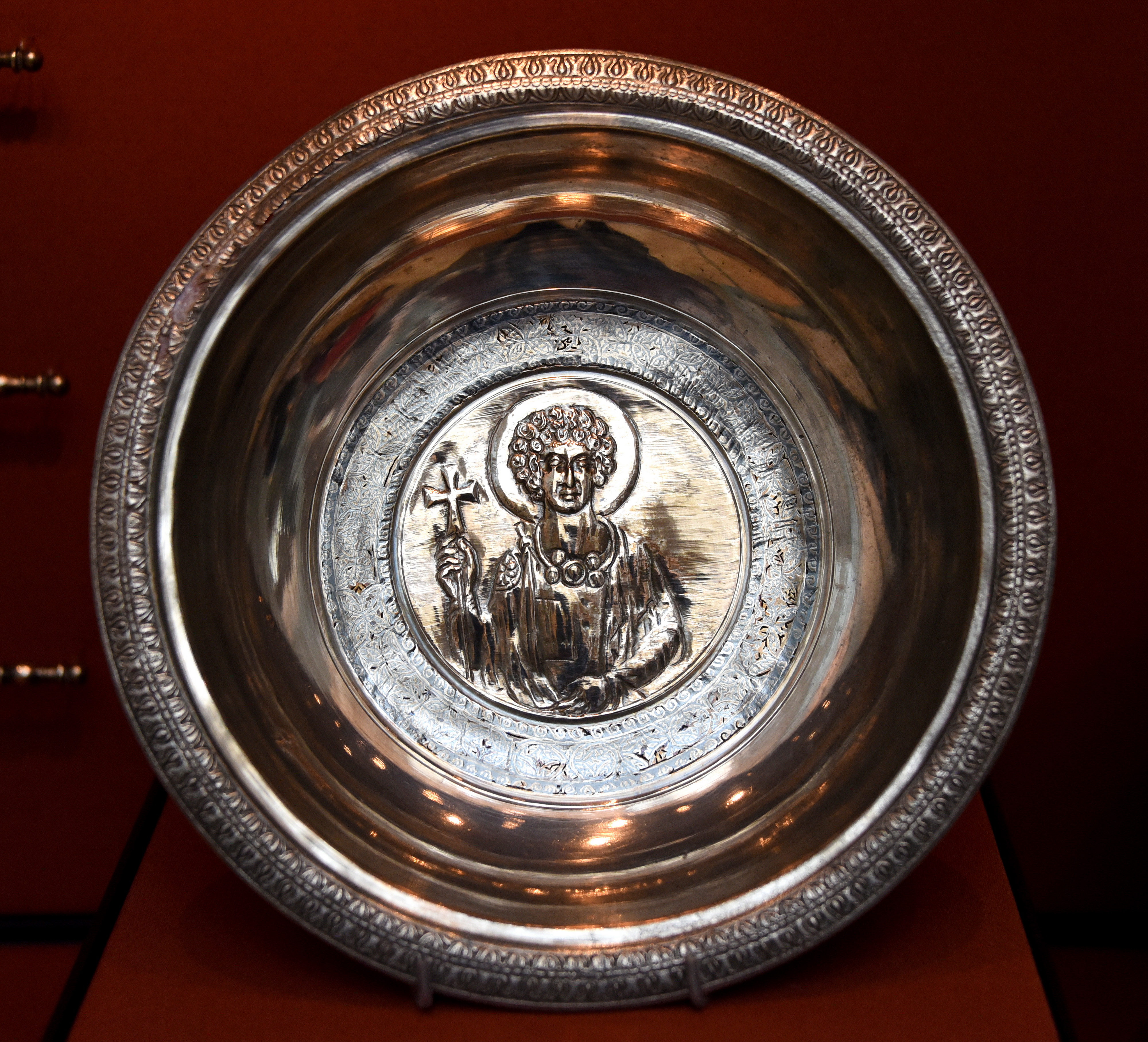 This vessel, decorated with Christian imagery may have been used in religious ceremonies. The figure depicted may be the Christian martyr Saint Sergius, a high-ranking soldier who was tortured and executed during the prosecutions of Emperor Diocletian (reigned 284-305 CE). He is dressed in a military cloak (chlamys) and a tunic pinned at the shoulder with a crossbow brooch (fibula). He also wears a type of neck-ring known as maniakion. Part of the Cyprus Treasure. At the end of 1800s CE, villagers recovered a remarkable hoard of Byzantine silver while quarrying stone from the ancient ruins of Lambousa, a town on the north coast of Cyprus. The hoard was found near the Acheripoetos Monastery, which was built on the site of an earlier Christian church from 500s CE. The pieces in the Cyprus Treasure may have originally belonged to this church. Circa 641-651 CE. Made in Constantinople, modern-day Istanbul, Turkey; found at Acheripoetos Monastery, Kyrenia, modern-day Nicosia, Cyprus. (The British Museum, London).