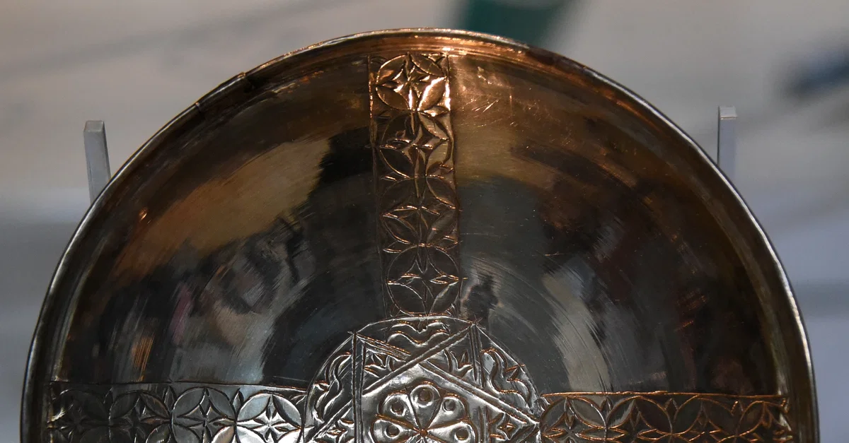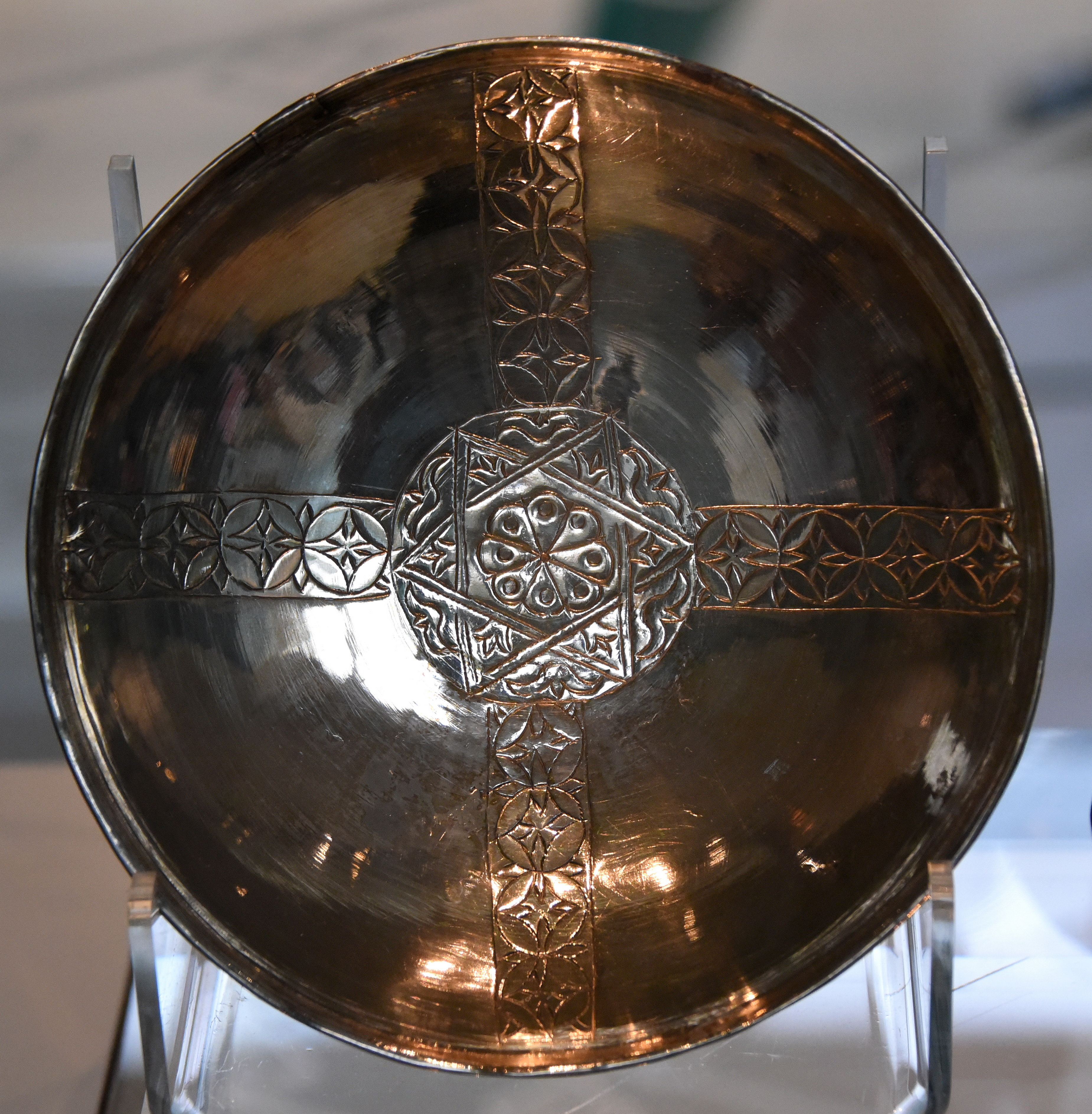 This shallow silver bowl is from a set of ten that were stacked upside-down inside the Suton Hoo burial chamber. They were made in the Eastern Mediterranean, possibly for religious use; their cross-shaped design may have had a Christian meaning. We don't know how the bowls were used after they arrived in Anglo-Saxon England, where Christianity was slowly taking hold. Donated by Mrs. Edith M. Pretty. Circa 500s to 600s CE. From the ship-burial mound 1 at Sutton Hoo, Suffolk, England, UK. (The British Museum, London).