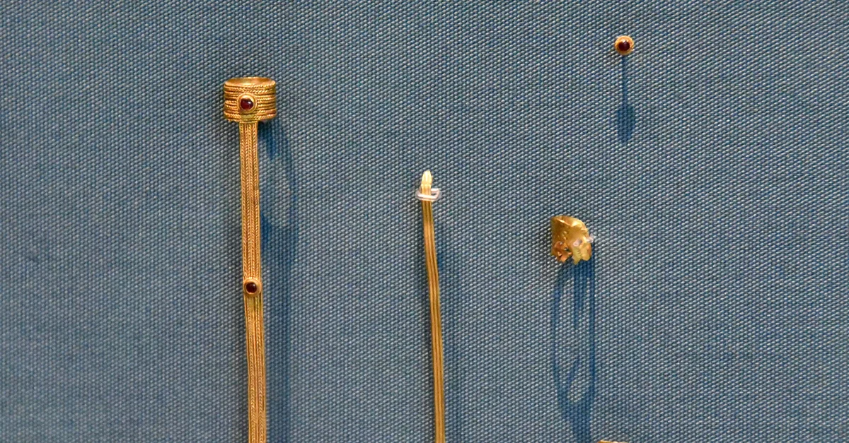 These enigmatic mounts may have been emblems of office. Rivets and rivet-holes show that some were attached to other objects, perhaps bone or ivory rods that decayed in the ground. The most elaborate mount comprises a gold filigree (beaded wire) ring attached to a strip with cabochon (domed) garnet settings. A similar setting was found elsewhere in the burial. The fluted strip has an animal-head terminal, while wolf-like beasts appear on the triangular and curved mounts. Donated by Mrs. Edith M. Pretty. Early 600s CE. From the ship-burial mound 1 at Sutton Hoo, Suffolk, England, UK. (The British Museum, London).