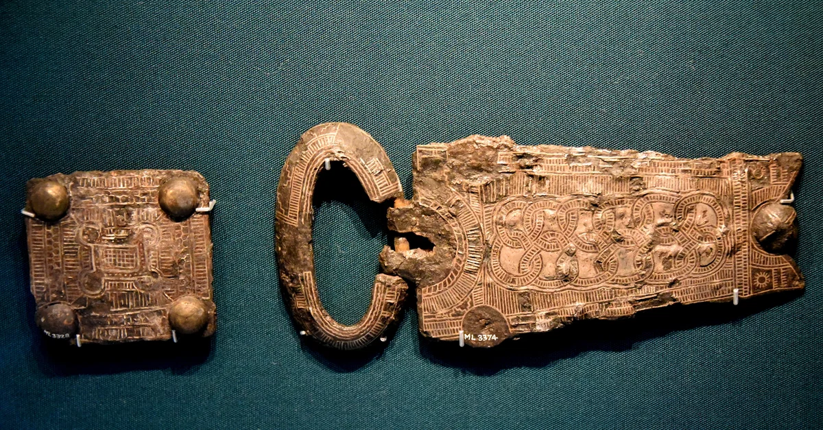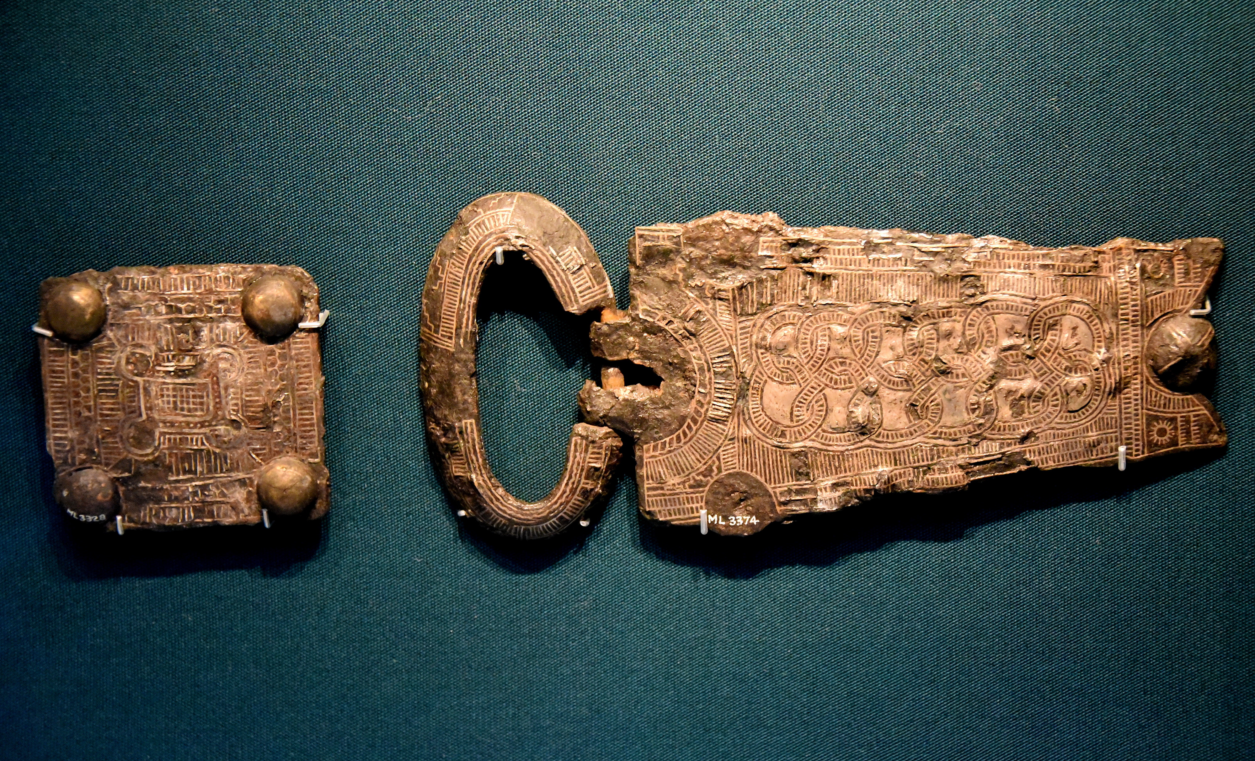 During the 600s CE, supplies of oriental garnets failed and gold and silver grew scarcer. As a result, Frankish jewelers turned to a decorative technique of inlaying designs and silver wire. These often imitated patterns used earlier in garnet cloisonne (inlaid cells) decoration, and were used on iron brooches, belt fittings, and weapons. Merovingian, circa 600s CE. From modern-day France; the fitting came from Marne Region while the belt was found in Bréban. (The British Museum, London).