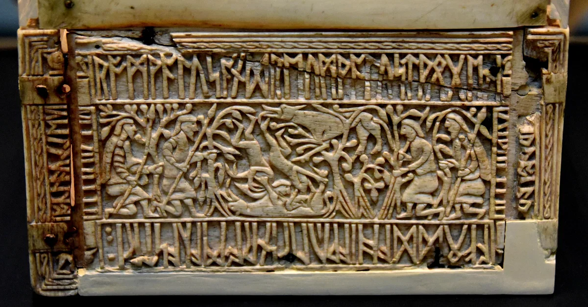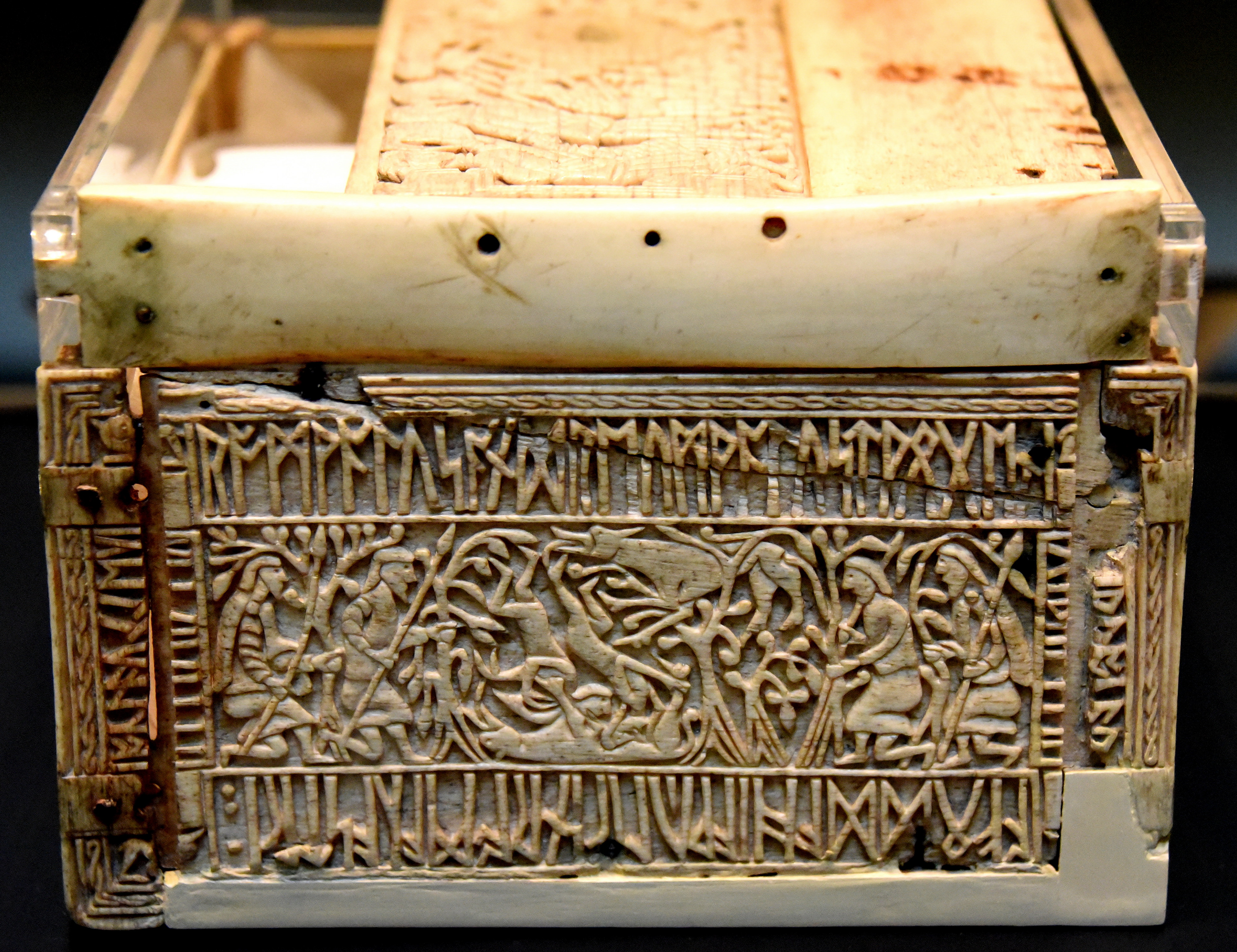 This panel depicts a scene from the famous Roman legend of twin brothers, Romulus and Remus. Abandoned as children, they were rescued and suckled by a she-wolf (centre). Another wolf, perhaps her mate, licks their feet, while men with spears rush in from both sides to capture or save the twins. Runes around the edges describe the scene. According to the legend, Romulus was eventually murdered his brother and found the city of Rome. The Casket was donated by Sir Augustus Wollaston Franks. Early 700s. From Auzon, Haute-Loire, Auvergne, modern-day France. (The British Museum, London).