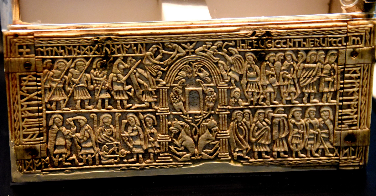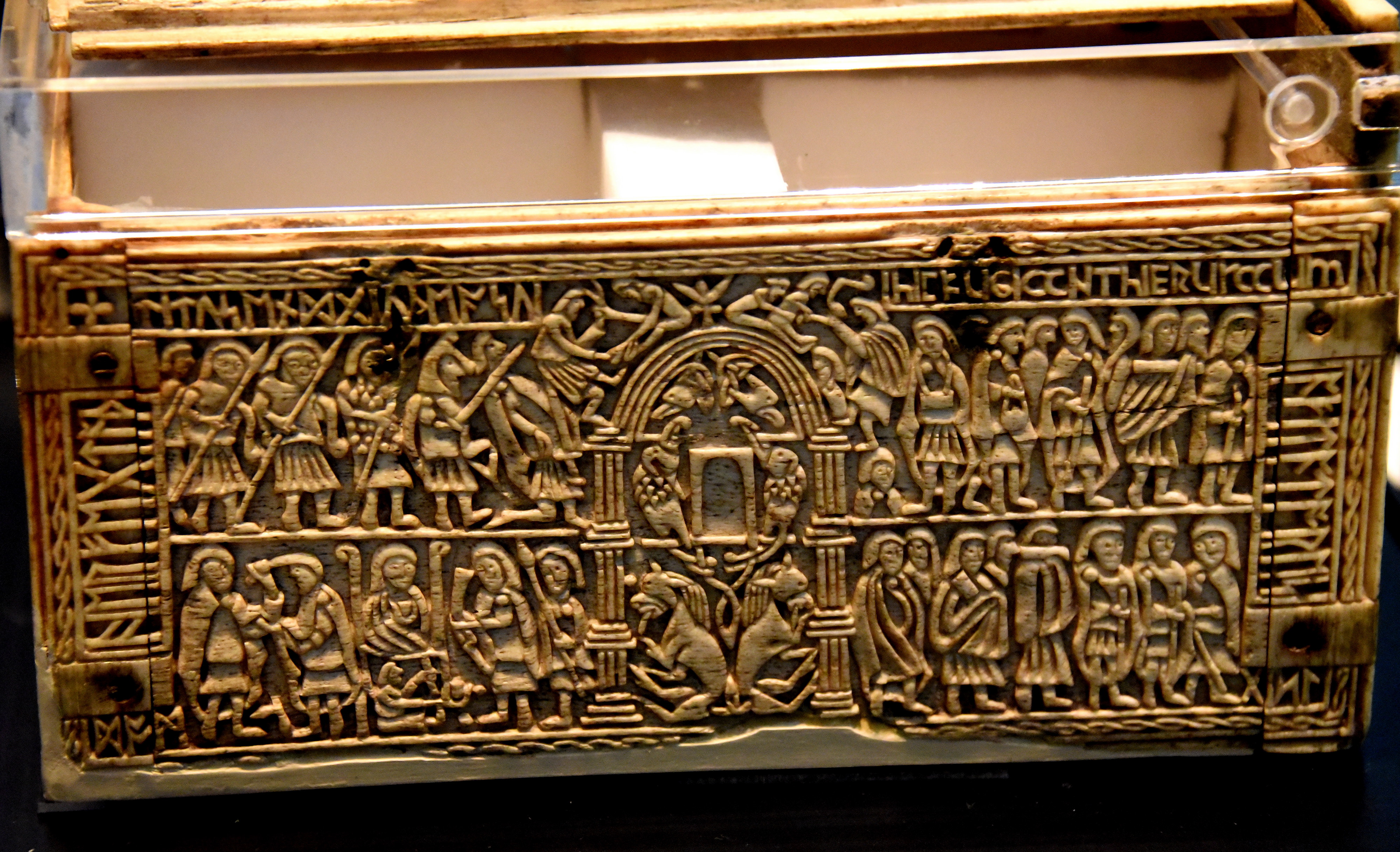 This is the back panel of the Franks/Auzon Casket. This panel depicts the capture of the city of Jerusalem in 70 CE by the Roman general (later Emperor) Titus. The inscription on this panel appears as a mixture of Old English, Latin, runes, and insular scripts. The labels on the two lower corners read "dom" (which means judgment) and "gisl" (meaning hostage). The Casket was donated by Sir Augustus Wollaston Franks. Early 700s. From Auzon, Haute-Loire, Auvergne, modern-day France. (The British Museum, London).