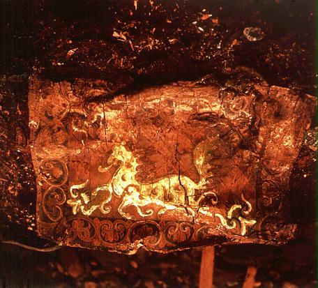 A painting of a winged horse on a birch bark saddle flap. From the Heavenly Horse Tomb, Gyeongju, Korea. Silla, 5-6th century CE.