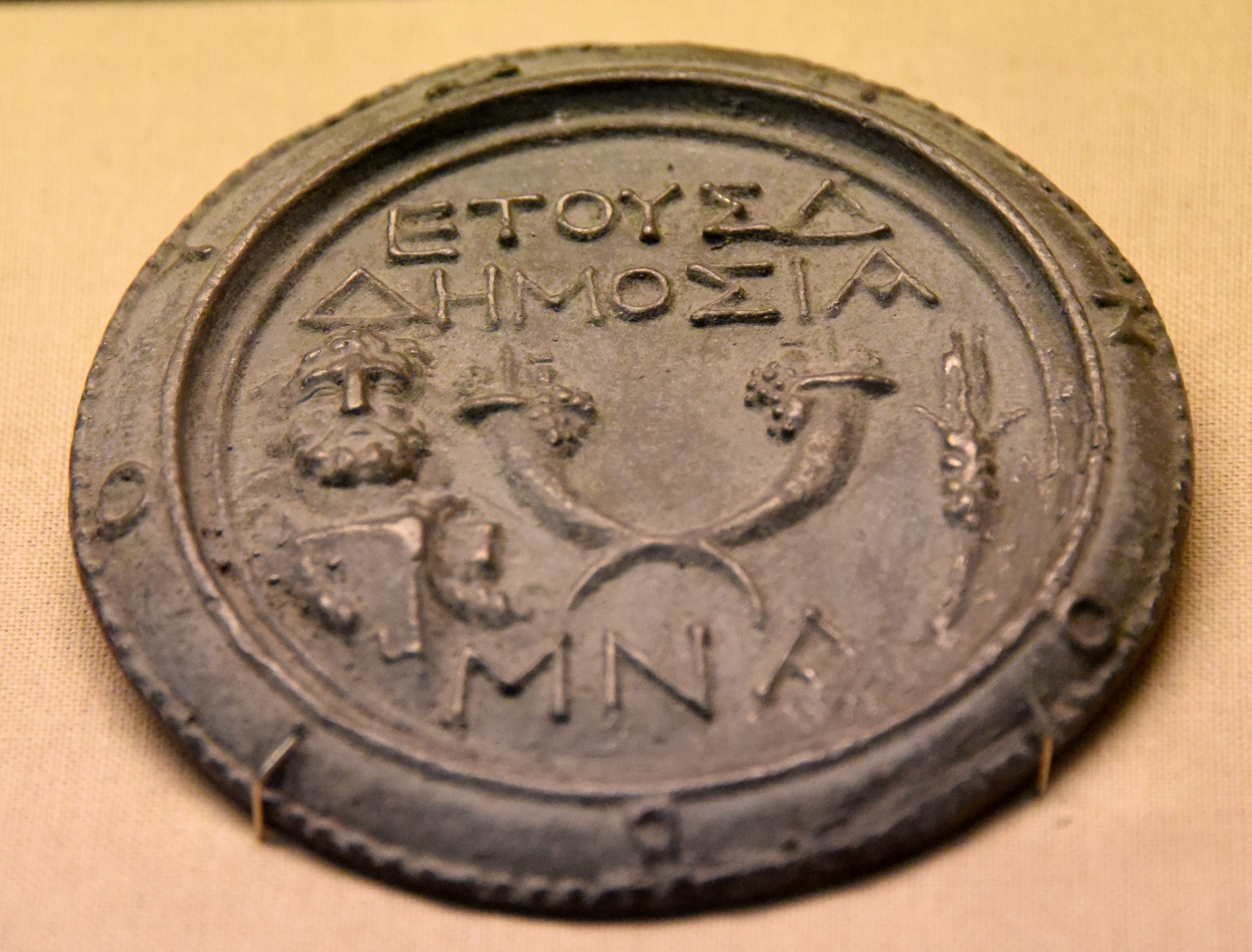 This lead weight was decorated with a terminal figure, cornucopia (horn of plenty), and an ear of barley. The weight is dated to the 4th year of a Hellenistic king. It is a standard mna (half stater) of a Greek city. A magistrate's name, Zenobios, appears around the edge. The weight is 784.4 grammes. Roman, made in the 2nd or 1st centuries BCE. (The British Museum, London).
