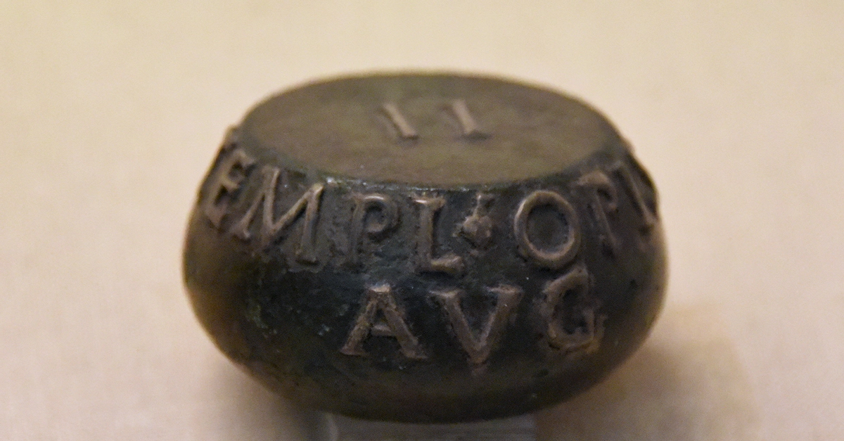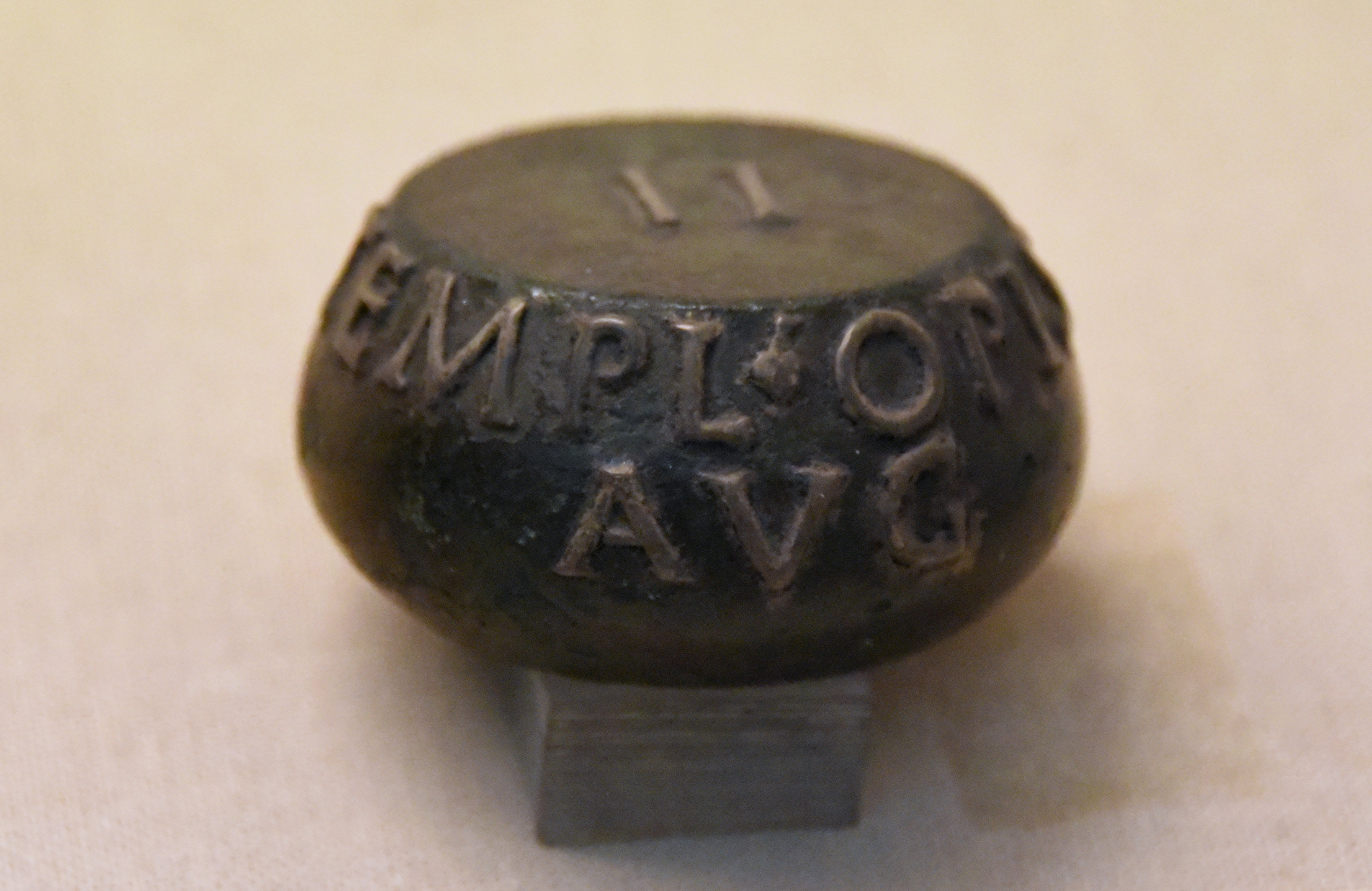 The weight is inscribed with the numeral II and the legend TEMPL(VM) OPIS AUG(USTAE). It may be a standard weight kept at the Temple of Ops (a goddess of plenty and fertility) on the Capitol at Rome. The weight is 713.6 grams, almost exactly 2 pounds, 2 ounces of the general Roman standard. Roman, probably made in Italy, 1st century CE. (The British Museum, London).