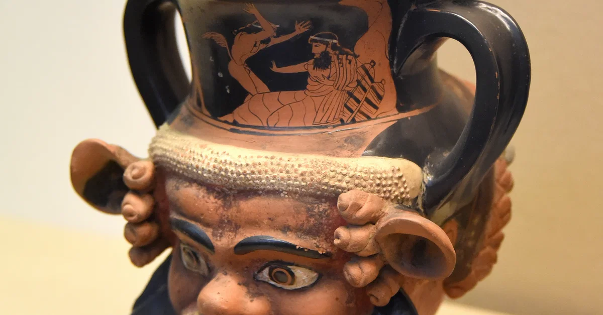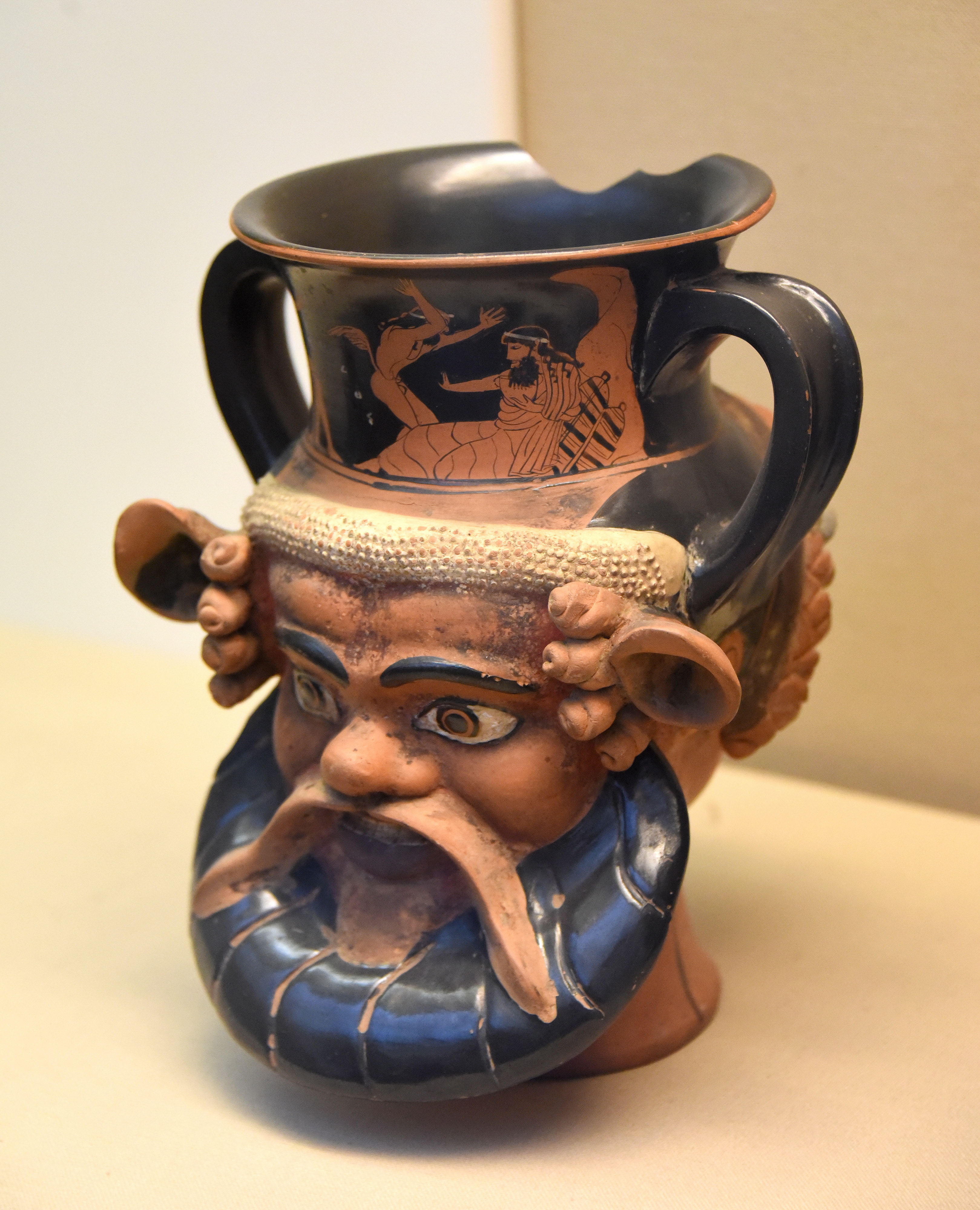 The moulded heads of a satyr and of a woman are joined back-to-back on this kantharos (drinking cup). Drinking from it, the (male) symposiast would have found himself confronted with 2 different images that represent opposites of himself. The same contrast is played out on the painted scene above, where wild Satyrs break into the civilized symposion. Greek, made in Athens, about 470 BCE. (The British Museum, London).