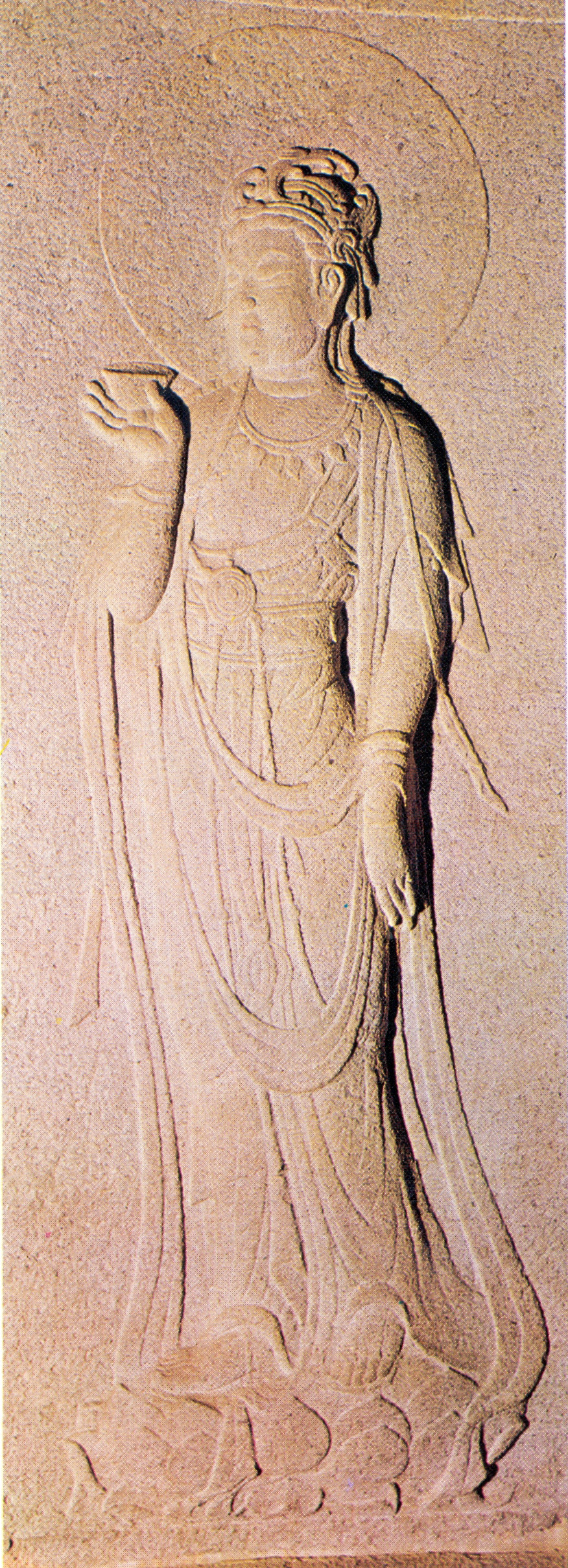 Two-metre high granite relief sculpture of Manjusri, a bodhisattva. The Seokguram Grotto, near Gyeongju, Korea. Height: over 2 metres. Unified Silla Period, 8th century CE.