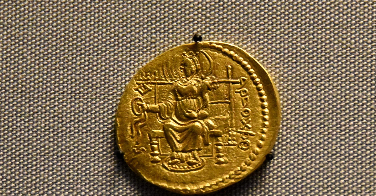 This Kushan coin depicts a goddess of prosperity seated on a throne; this goddess was known to the Kushans as Ardochsho. Almost all late Kushan coins used the design of a seated goddess, and the Kushan Emperors produced these coins in large numbers. Kushan Emperor, Ganghadra, modern-day Pakistan, circa 230-250 CE.
