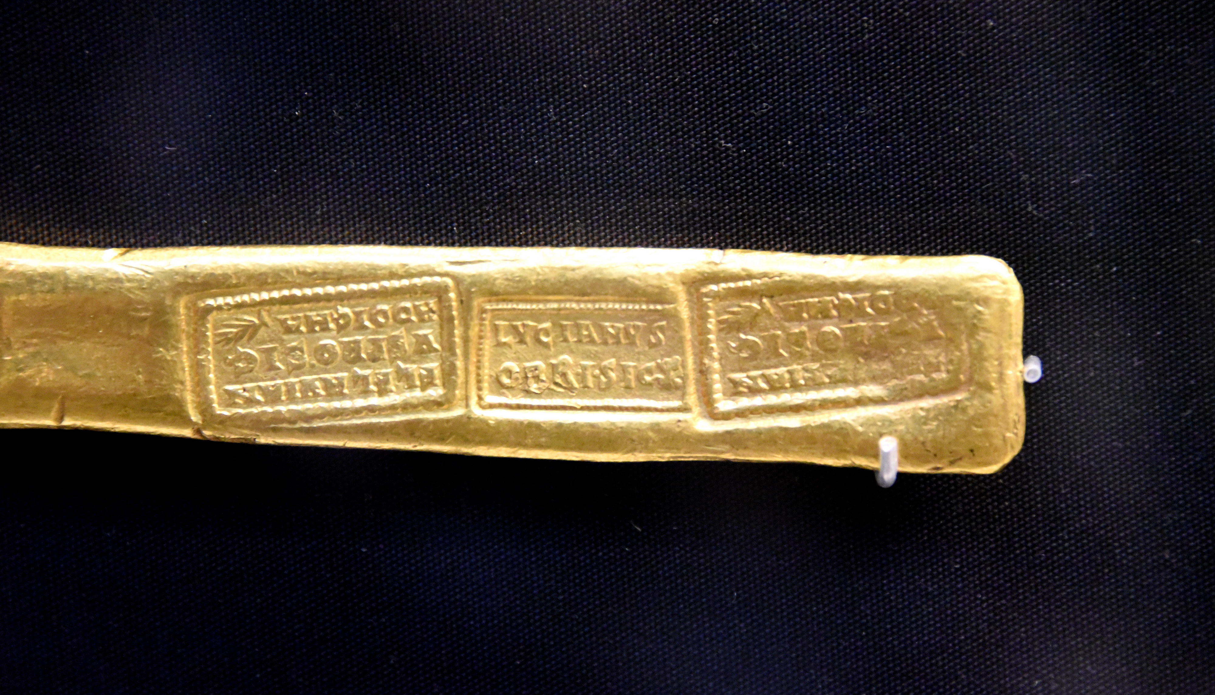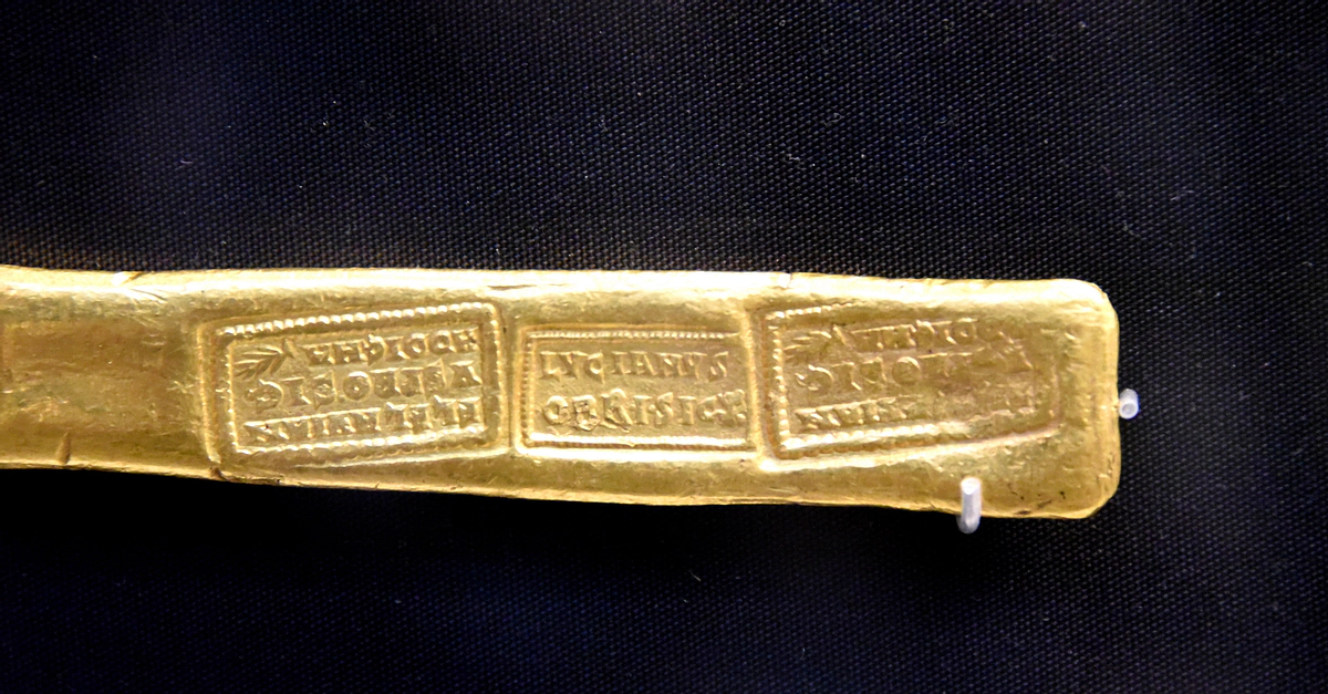 In the Late Roman Period, precious metal that had been paid in tax was melted down into bars before being re-minted, to eliminate plated forgeries. Because local mint officials could be corrupt, the bars were stamped with the names of the Emperor's representatives who came to test the purity of the gold. Roman Empire, 250-400 CE. From Aboukir, Egypt. (The British Museum, London).