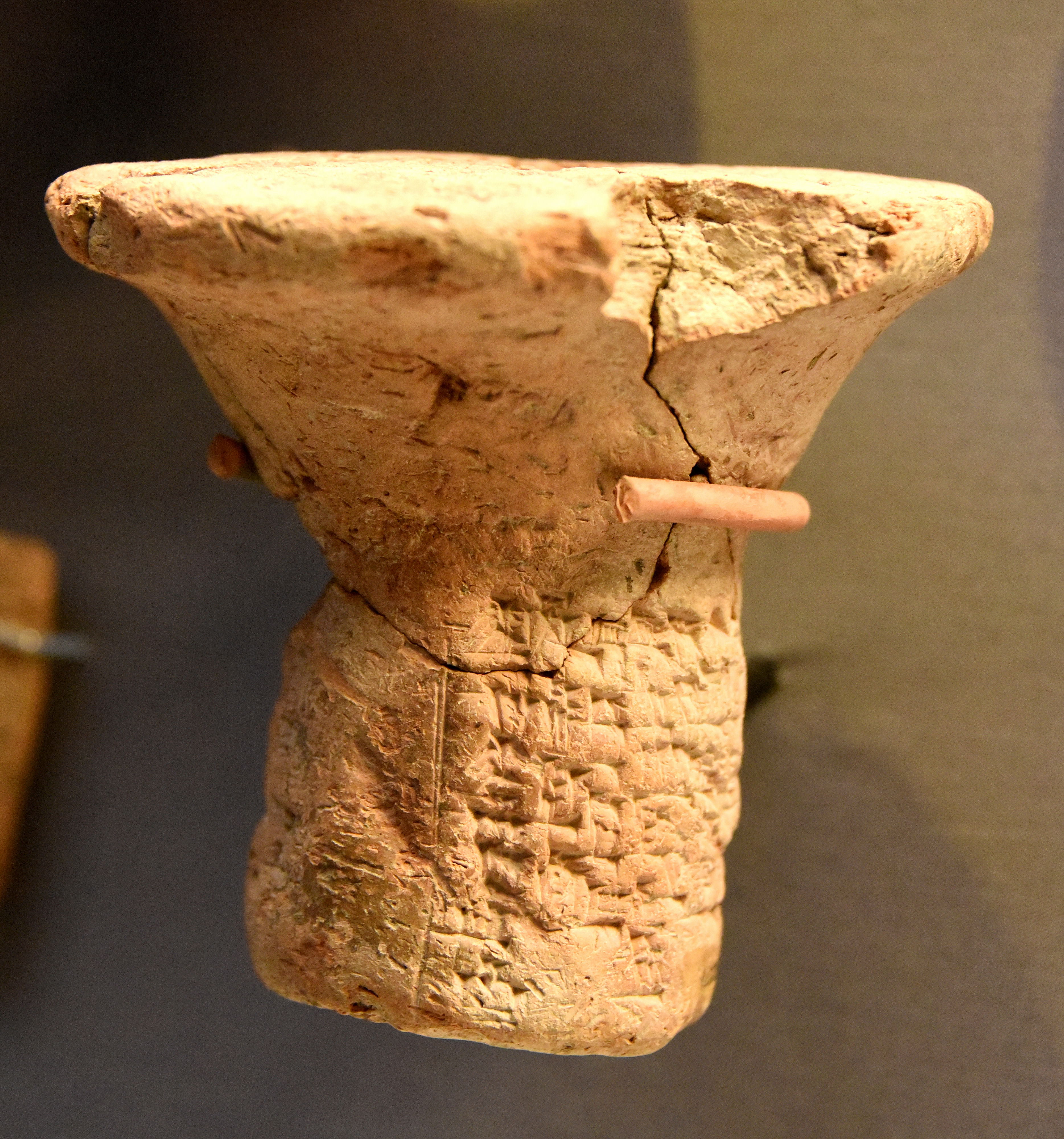 This clay nail is inscribed with details of the wealth of Sin-Kashid, king of Uruk in Babylon. Excavated by Sir William Loftus at Uruk (Warka), Southern Mesopotamia, modern-say Iraq. Circa 1900 BCE. (The British Museum, London).