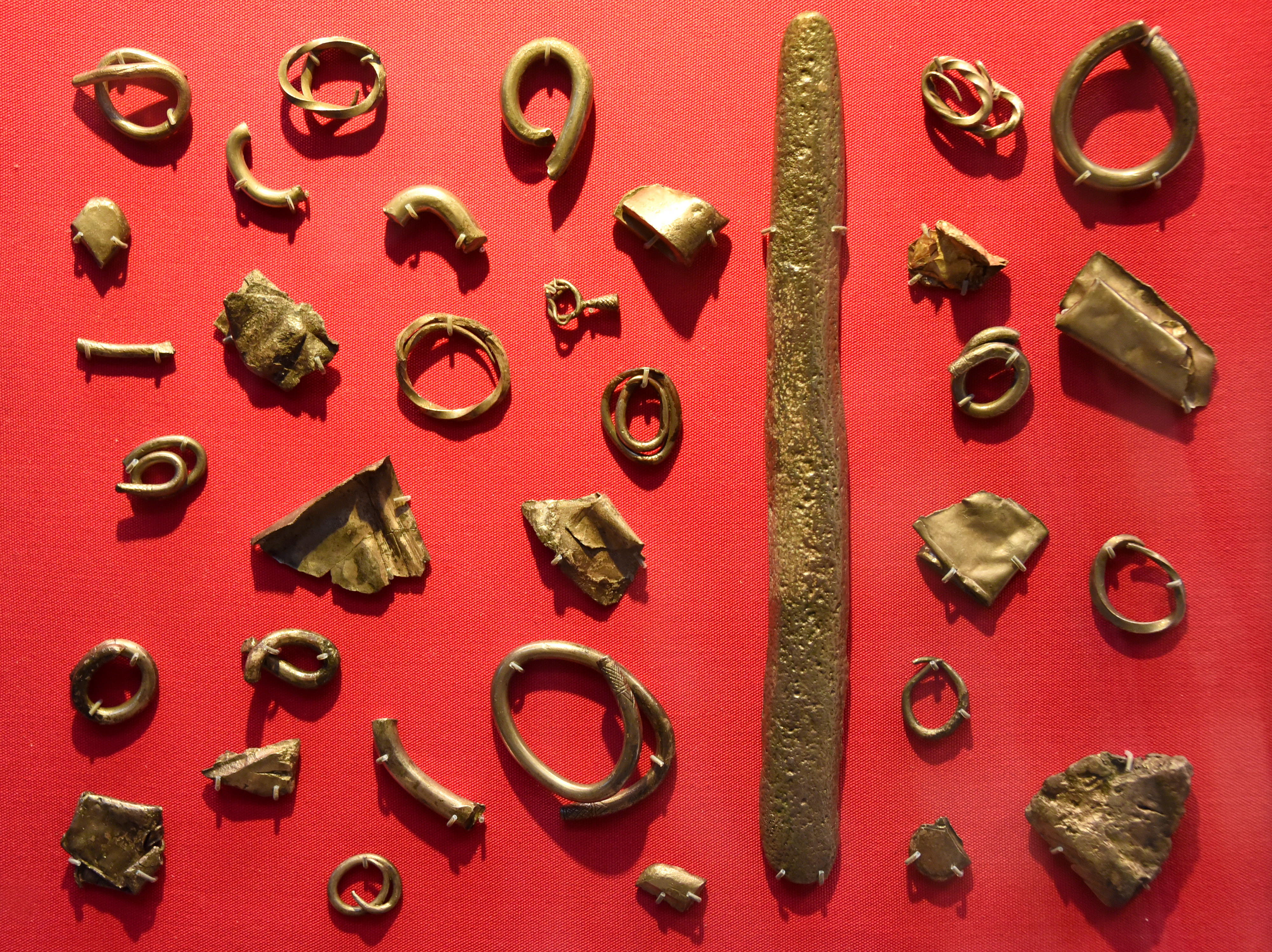 This hoard contained 23 bars of gold, several bars of silver, rings, pieces of scrap, and a silver figurine. The pieces were cut for specific transactions or other reasons, but not to conform to a weight standard. In making payments, it was often not the actual metal that changed hands. Rather, agreed amounts or weights of metal were the units of account that were recorded. From El-Amarna, modern-day Egypt. 18th Dynasty, 13352-1336 BCE. (The British Museum, London).