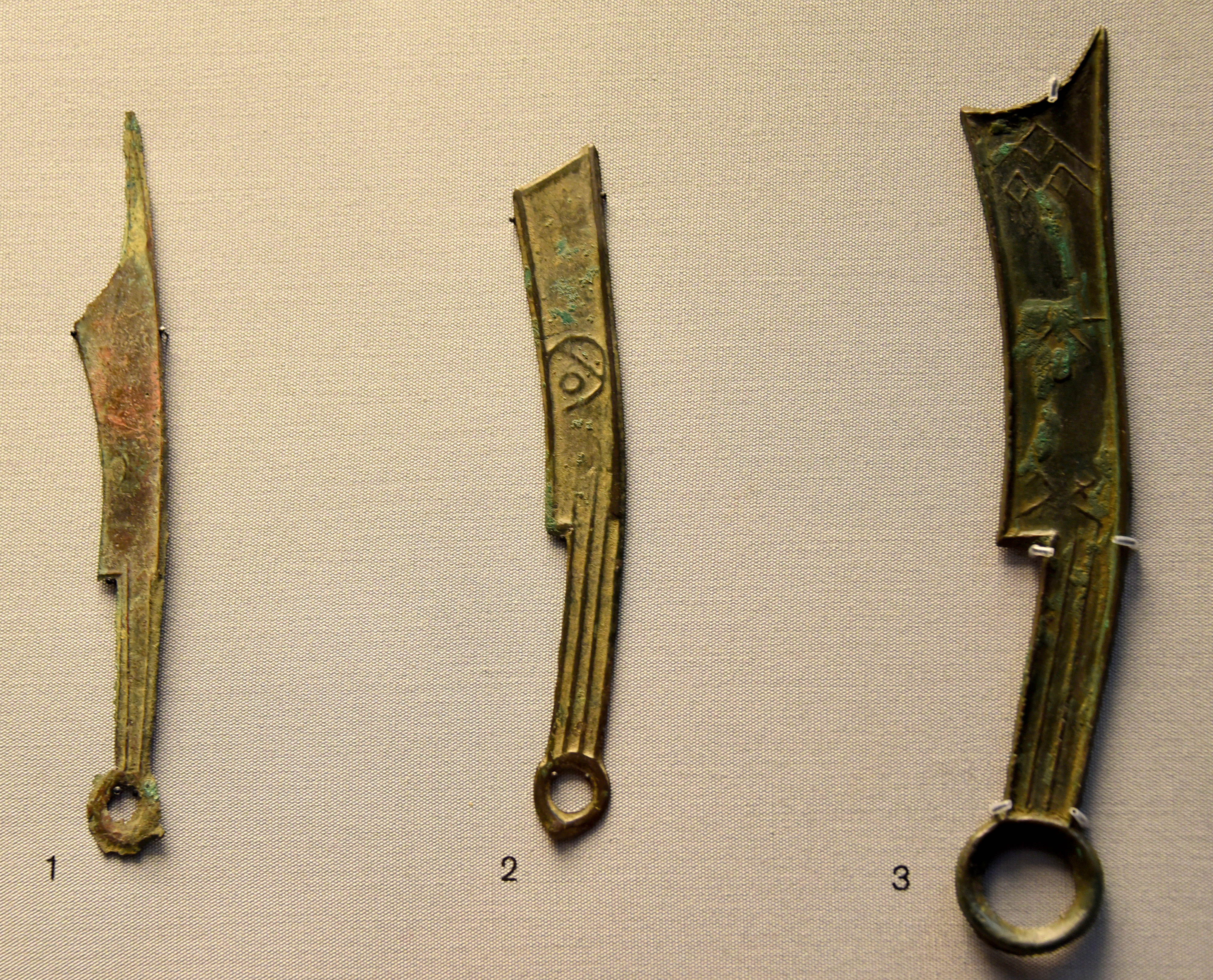 Knife money of the Warring States period retained some features of the real tools, including the ring and the strengethening ridges on the handle. The States in the north and north-east issued knife money. 1. Zhao State, circa 500 BCE, Warring States period. 2. Yan State, circa 400s BCE, Warring States period. 3. Qi State, circa 300 BCE, Warring States period. From China, 475-221 BCE. (The British Museum, London).
