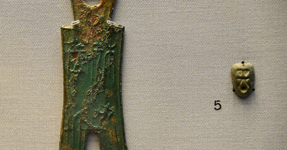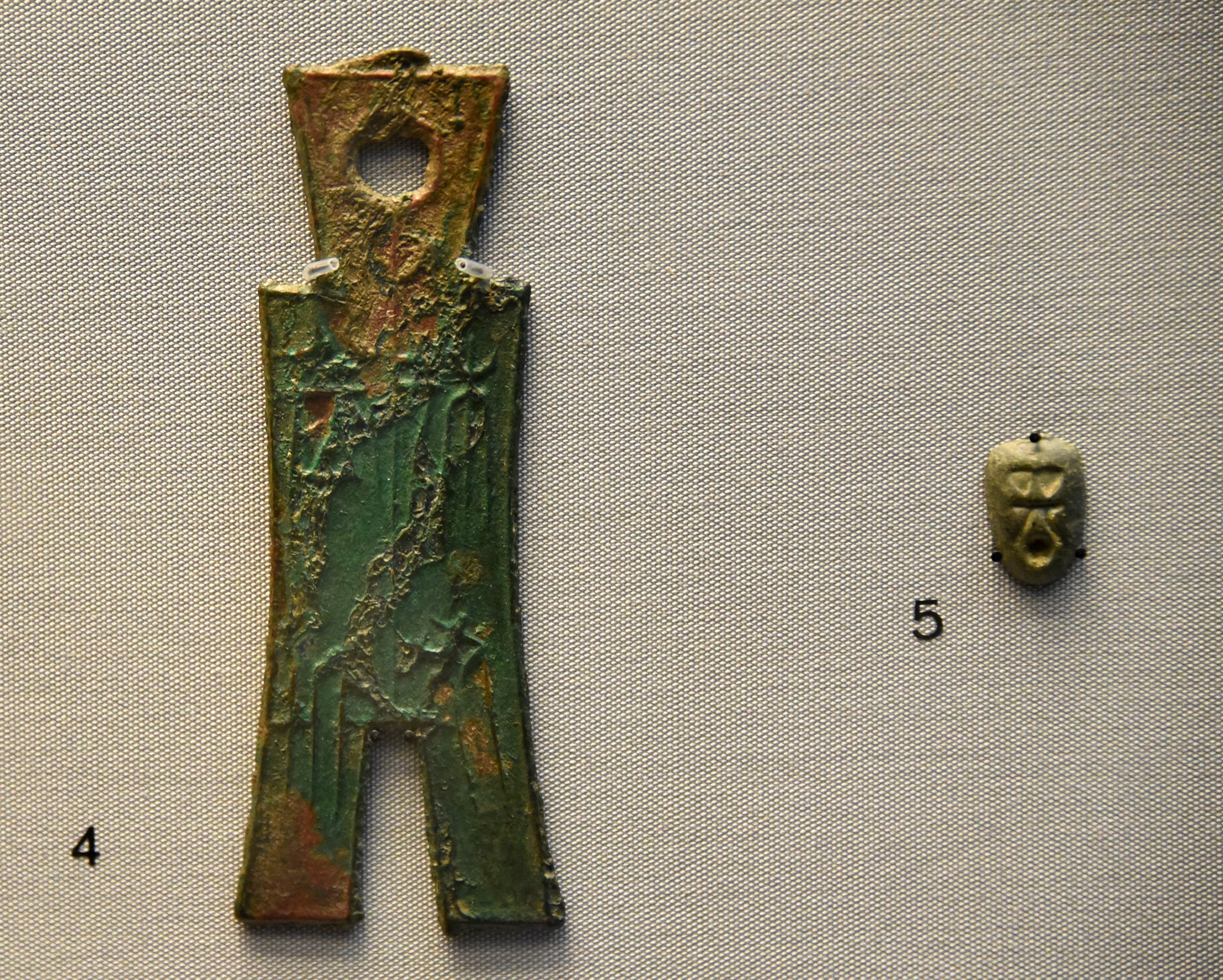 The Chu State in south-east China had a unique culture of its own, yet also interacted with other states. This is reflected in the variety of its coinage: small bronze coins (known as "ant-nose" money modelled on cowrie shells), spade money, and gold ingots. 4. Spade money with 10 huo, Chu State, Warring States period. 5. "Ant-nose" money, Chu States, Warring States period. From China, 475-221 BCE. (The British Museum, London).