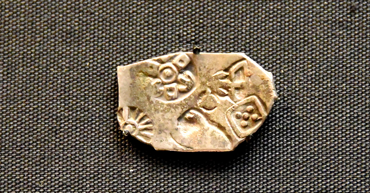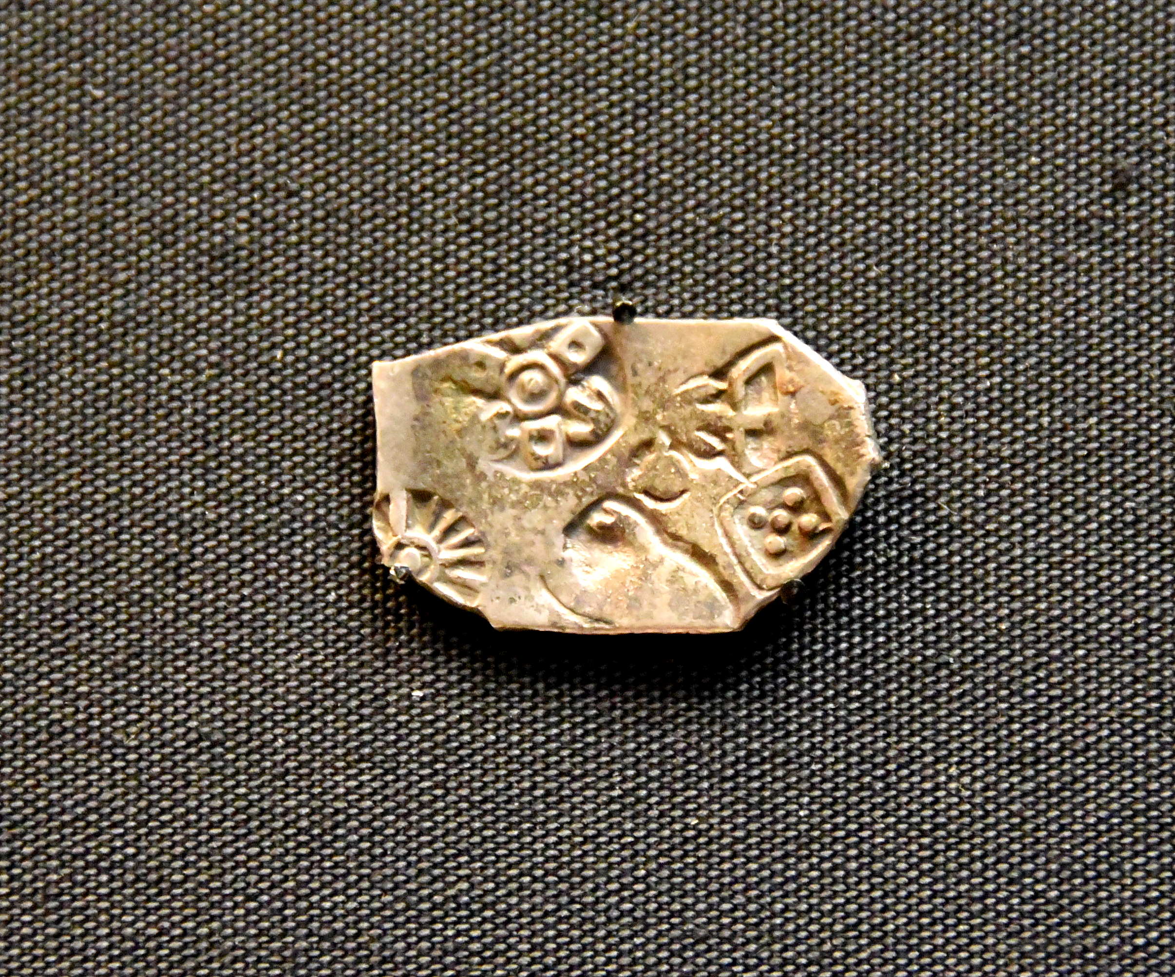 Early Indian coins were made by cutting sheets of silver into pieces and marking each piece with one or more symbols using small punches. As there are no portraits or inscriptions, the coins are now known by numbers. This coin, for example is known as "Series I Type VIII". From Magadha, modern-day Northern India. 350-300 BCE. (The British Museum, London).