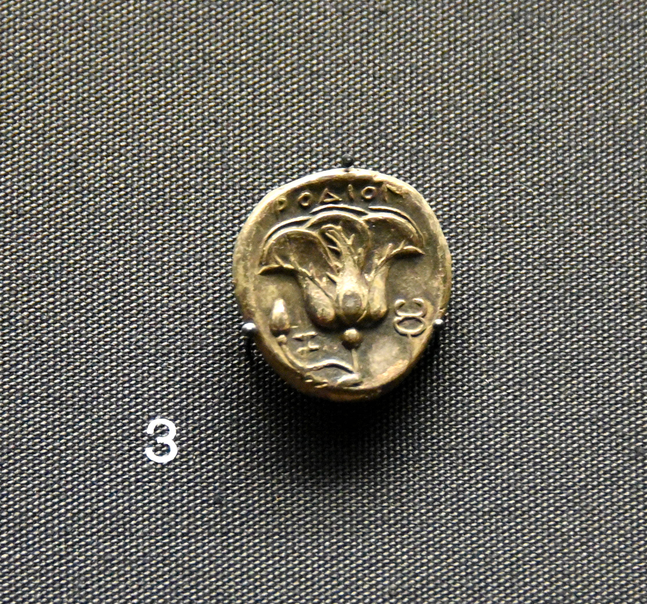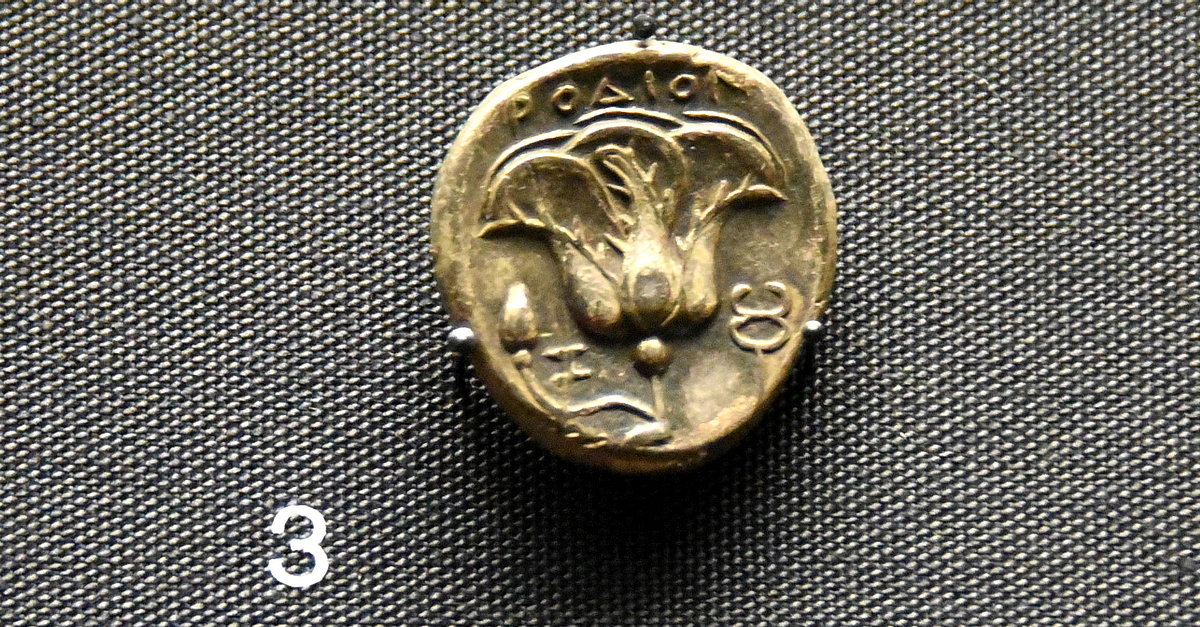 Some Greek cities used images for their names, so "readers" did not have to be literate. In Rhodes, a rose (rhodon) was used. Silver tetradrachm coin, circa 400-380 BCE. From Rhodes, Greece. (The British Museum, London).