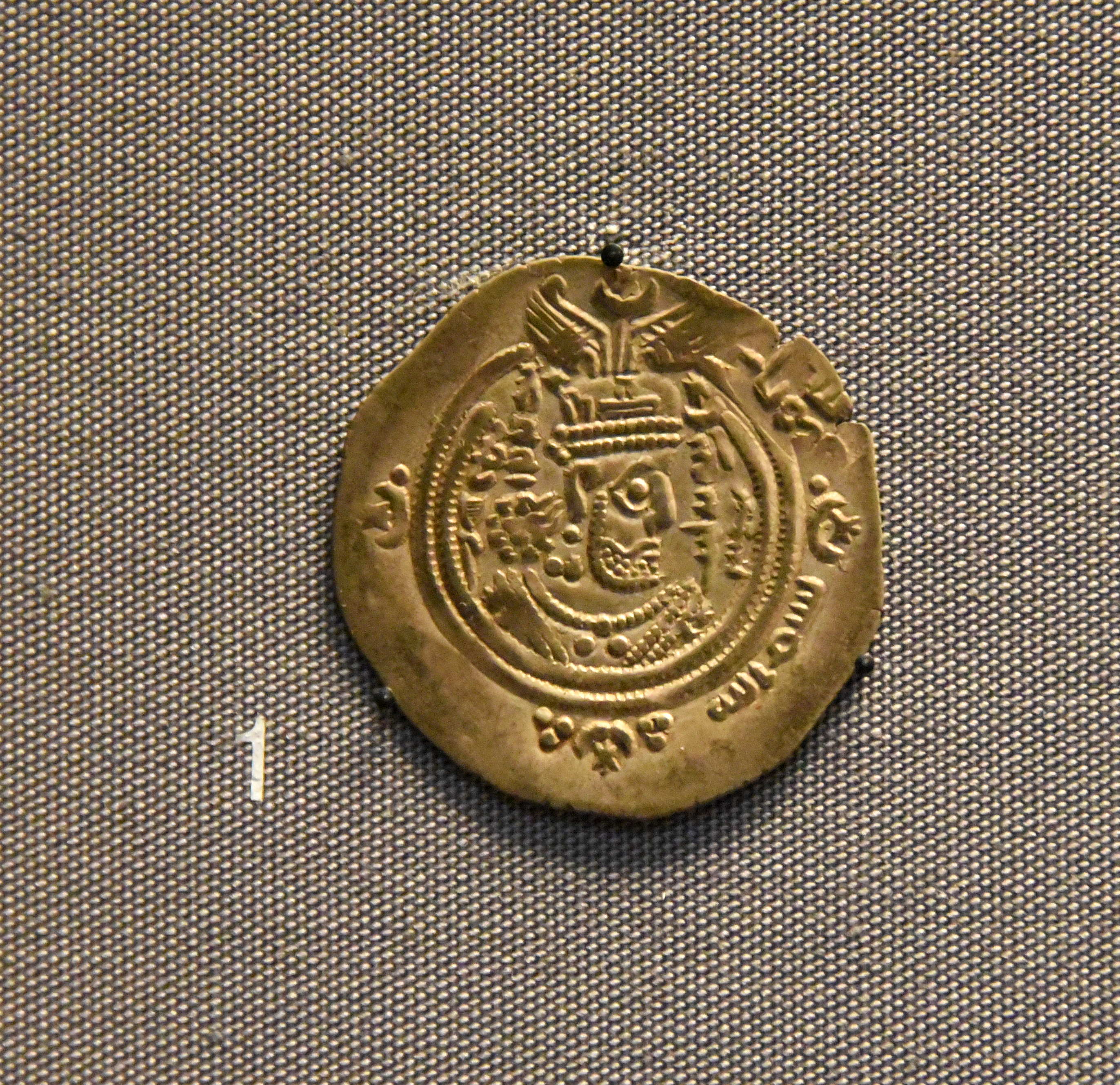 Silver coin of "Abdalla ibn Khazim". From Merv (modern-day Turkmenistan), circa 684 CE. Found inside the Buddhist monument (called deposit A) at Manikyala, modern-day Pakistan. This shows that coins from several places all circulated at the same time in ancient Afghanistan. From India Office Collection. (The British Museum, London).
