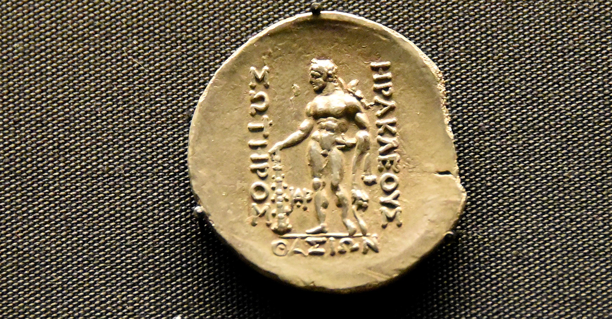 Early Iron Age Celtic people copied Greek coins, often faithfully reproducing their designs and inscriptions. This suggests that Thracian die-engravers were illiterate, as legible Greek letters were gradually replaced by abstract patterns and dots. Silver tetradrachm coin from Thasos (a Greek island, part of the North Aegean Sea), circa 200-100 BCE. From the Thomas Burgon Collection. (The British Museum, London).