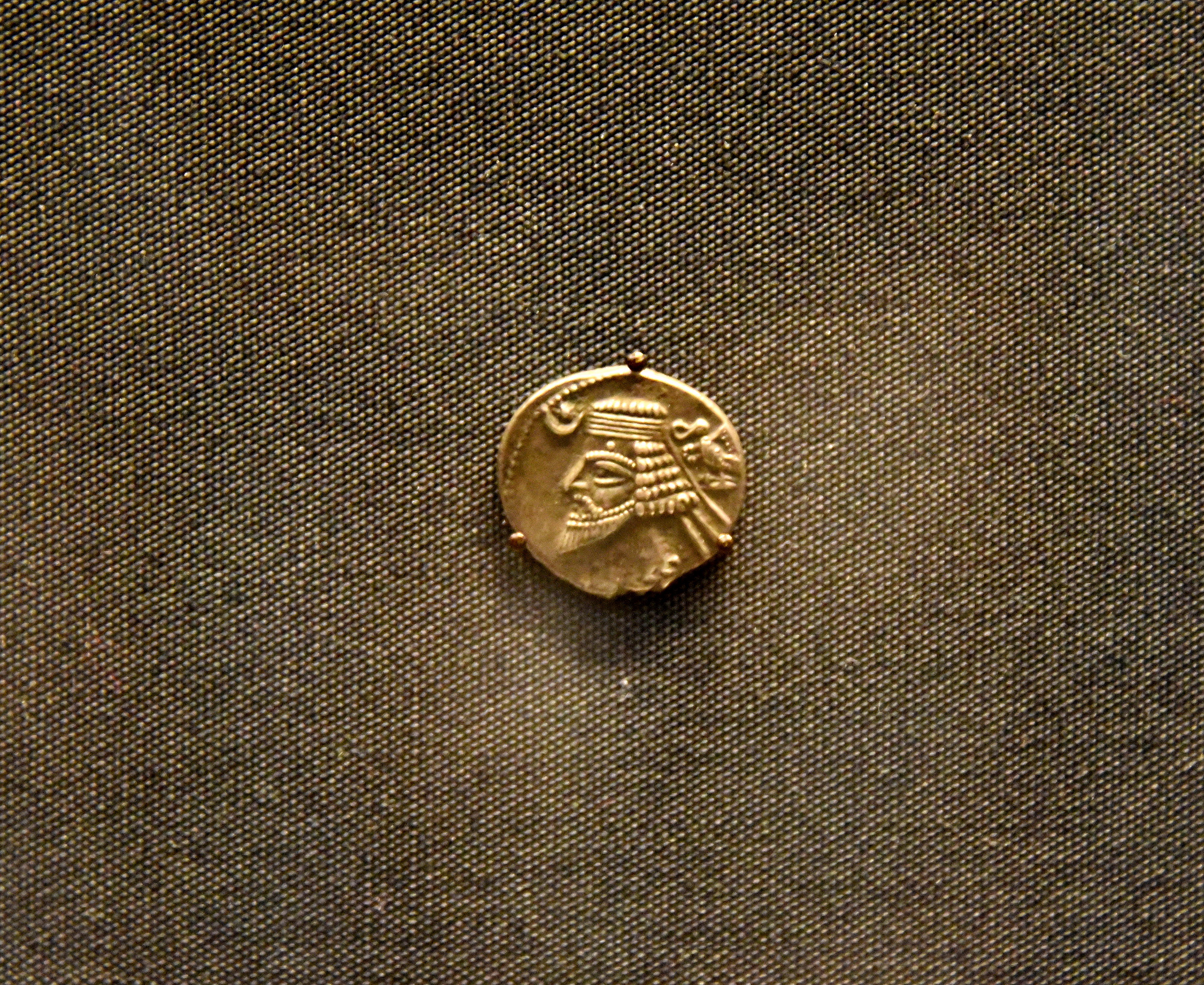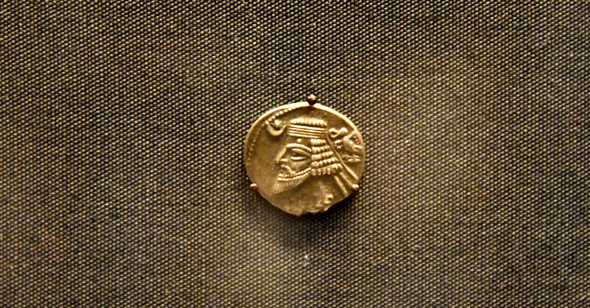 The Parthian "King of Kings " Farhad (Phraates) IV, reigned 38-2 BCE, is shown wearing a royal headband (diadem). Divine symbols of the moon crescent and star, and an eagle holding a royal headband, indicate that the king is the rightful ruler who enjoys divine support. Silver tetradrachm coin minted in the Parthian Empire, Iran and modern-day Iraq, 38-2 BCE. From Sir Charles William Chadwick Oman Collection. (The British Museum, London).