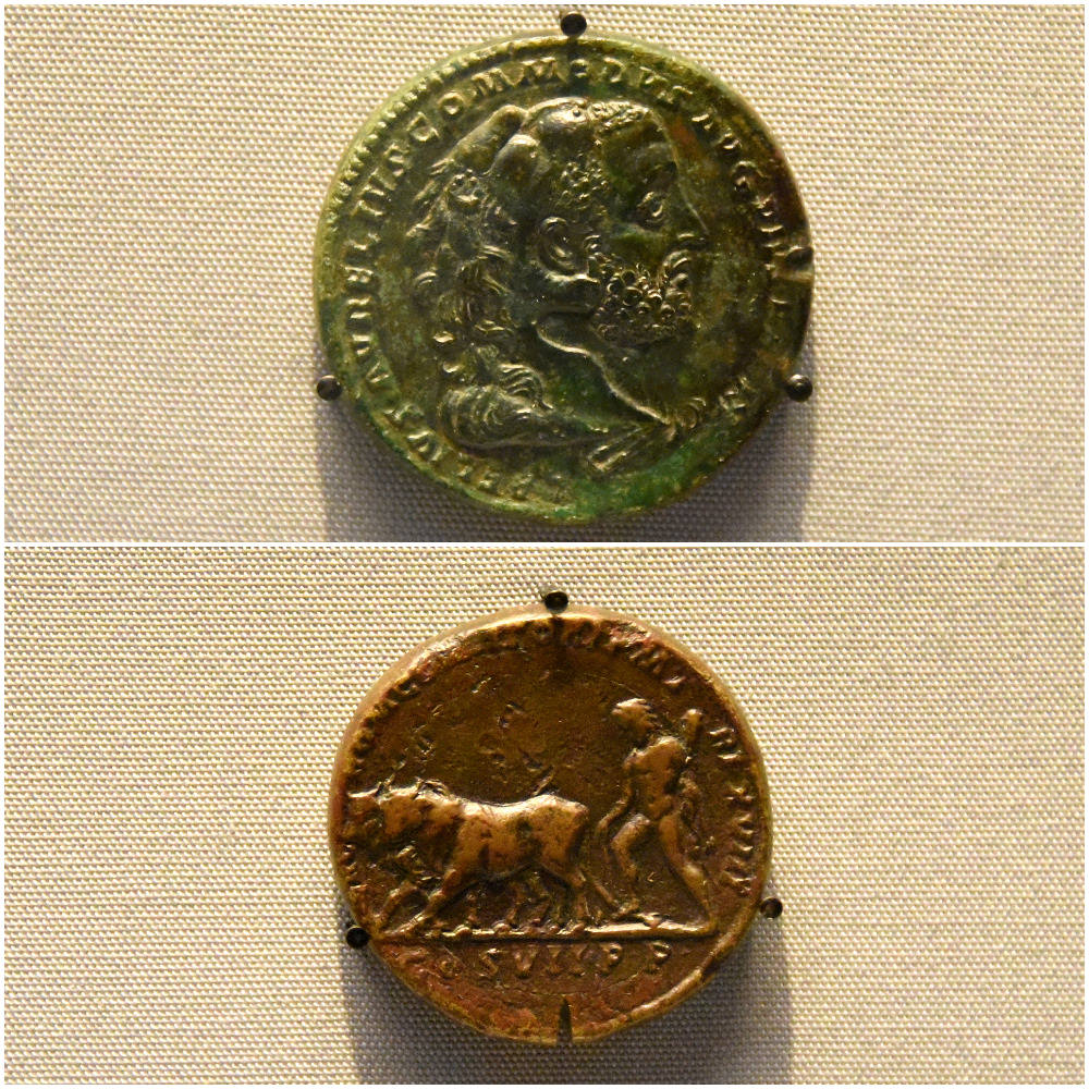 The Emperor Commodus wished to be identified with the god Hercules. On these medallions, he is depicted as Hercules, with a lion-skin headdress (upper image). He is also shown ploughing a ritual furrow to re-found Rome in his own name (lower image). Commodus became unpopular and was assassinated in 192 CE. Copper alloy medallions from Rome, Italy, circa 192 CE. The upper coin is from the Edward Wigan Collection while the lower one is from the Cracherode Collection. (The British Museum, London).