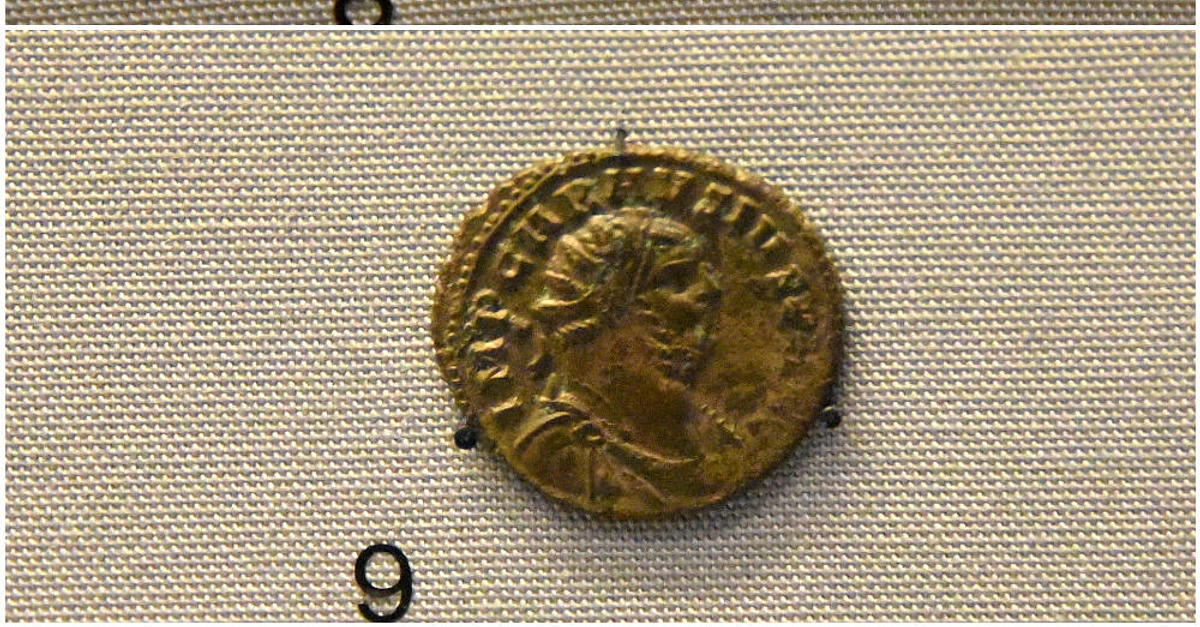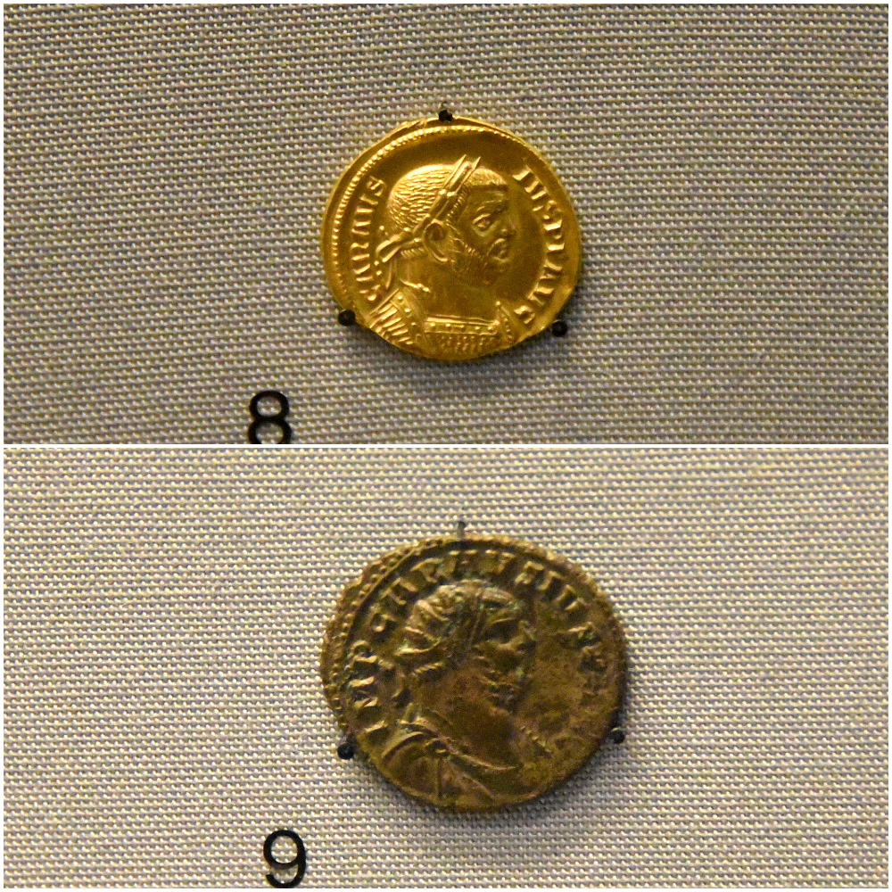 The rebel Carausius (Marcus Aurelius Mausaeus Valerius Carausius) declared himself emperor, making Britain his base. Although he had no authority in Rome, he stressed his Roman identity by citing the poet Virgil on his coins. He also used Roman symbols, such as the wolf and twins. Upper image: Gold aureus coin of Carausius, from London, England, circa 293 CE. From the Cracherode Collection. Lower image: Radiate coin of Carausius, from London, England, circa 286-293 CE. G. Barnett bequest. (The British Museum, London).