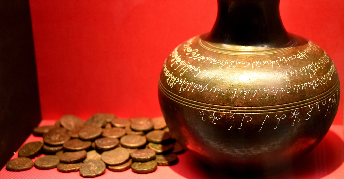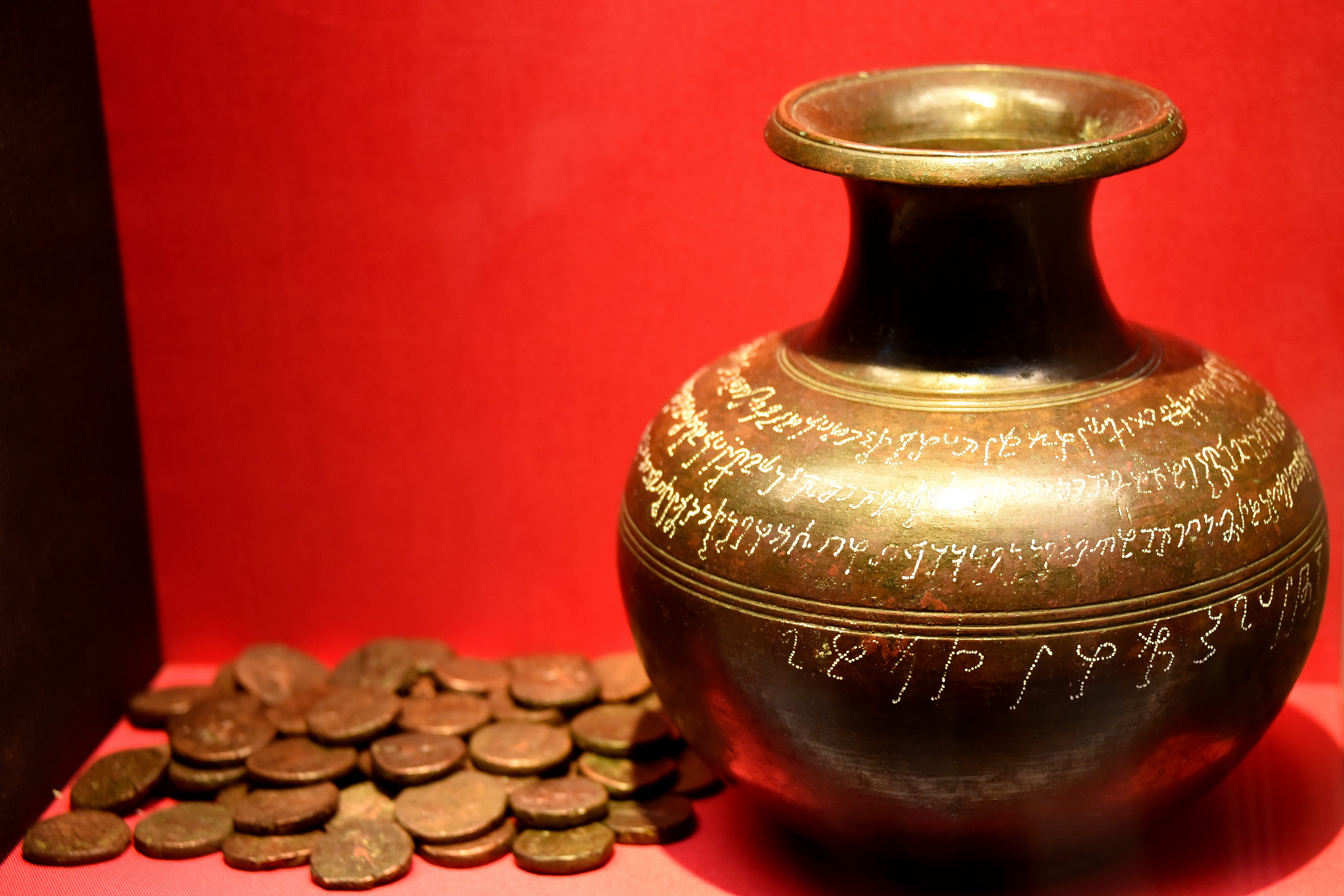 This vase and 66 coins were part of a group of offerings dedicated to the Buddha by a man named Vagramarega (his name was inscribed on the vase), for the benefit of himself and his family. Coins were often included in Buddhist offerings in this period. They were symbolic of material and spiritual wealth, and were used to increase the merit of the dedication, which the donor could then share with others. 66 copper coins from Wardak, modern-day Afghanistan, circa 110-178 CE. The vase came from a Buddhist stupa (in Afghanistan), transferred from the India Museum in London. (The British Museum, London).