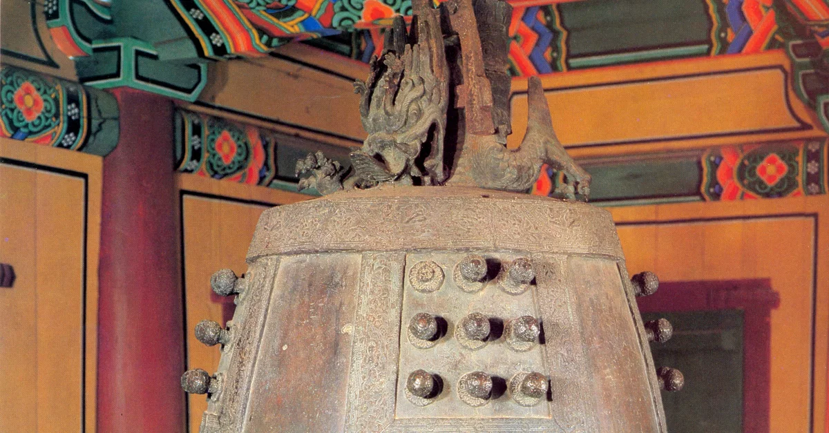 The bronze bell at the Buddhist Sangwonsa temple in Pyeongchang. The bronze-cast bell dates to 725 CE and is the oldest surviving such bell from ancient Korea.