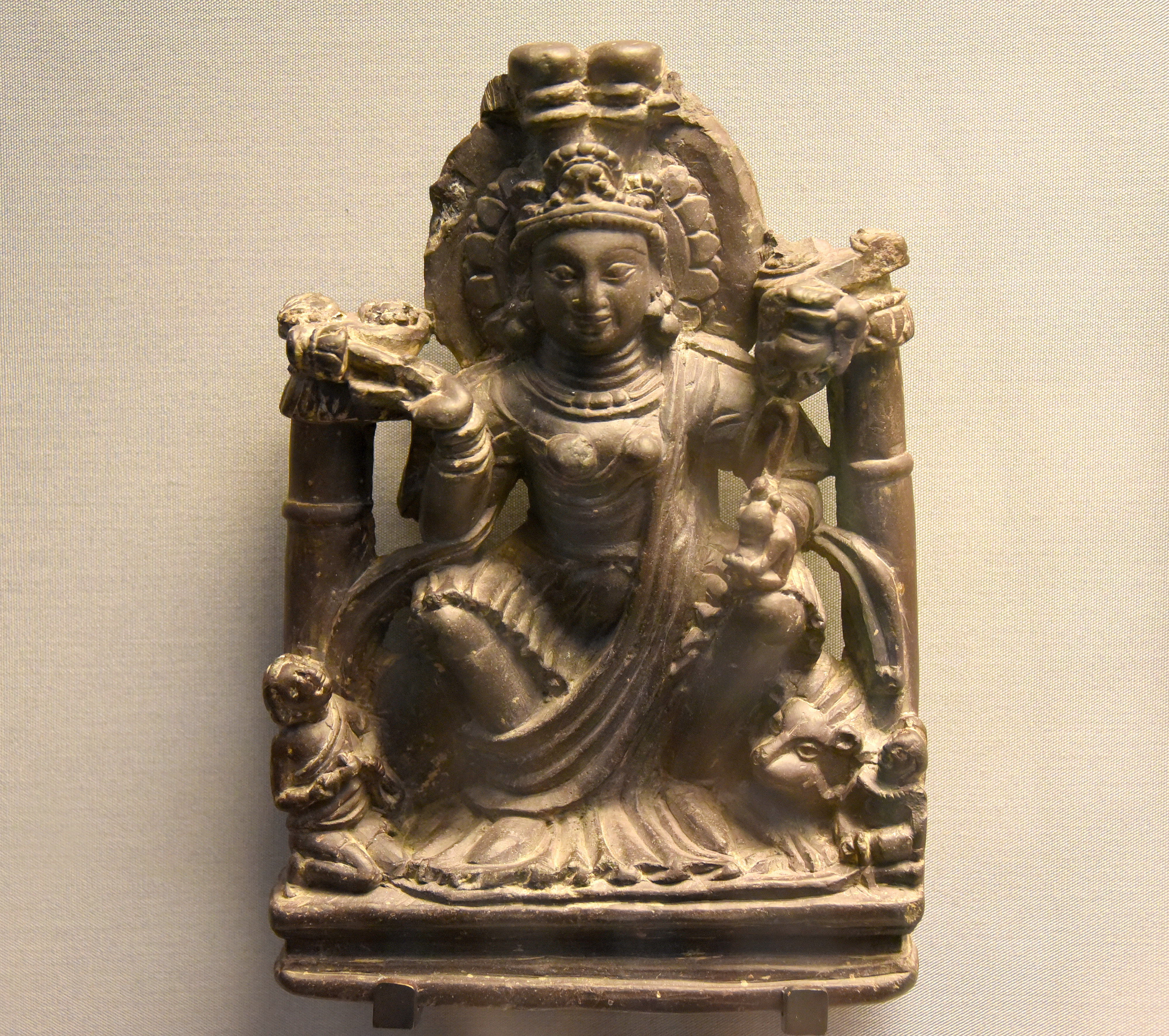 This statue of the goddess of prosperity shows her seated on a lotus and a lion. She holds a lotus bud in her right hand and the pot of abundance in her left. These symbols of prosperity derive from the horn of plenty (cornucopia) carried by the Kushan goddess. Stone statue, from Kashmir, circa 650-700 CE. Purchased with support from the Brooke Sewell Permanent Fund. (The British Museum, London).