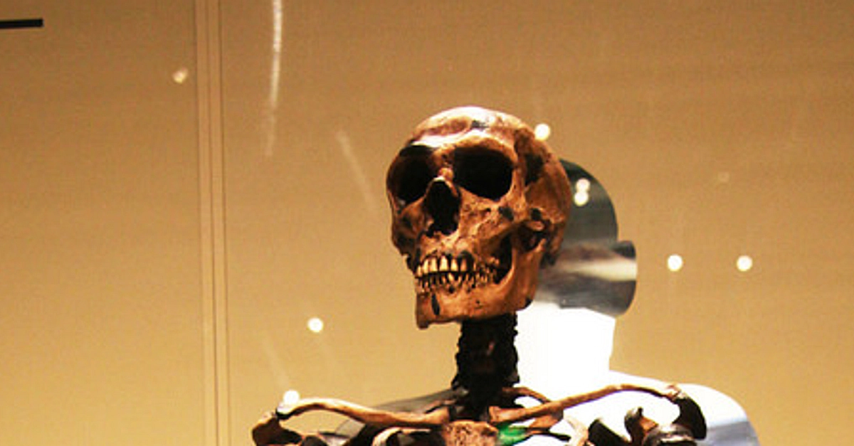 Skeleton of an adult male Neanderthal. The lighter parts are fossil, whereas the darker parts have been reconstructed. It is on display at the Smithsonian Museum of Natural History in Washington, D.C.