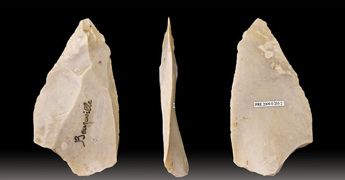 A Levallois point flint tool from the Mousterian lithic industry, made by Neanderthals. It was discovered in Beuzeville, France and is on display at the museum of Toulouse, France.