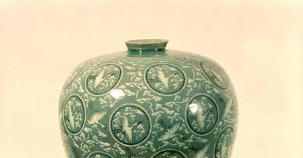 A maebyeong celadon (greenware) vase from the Goryeo dynasty of ancient Korea. The inlay design has typical Buddhist motifs of cranes and clouds. Late 12th century CE. National Treasure No. 68. (Kansong Museum of Fine Arts, Seoul, South Korea)