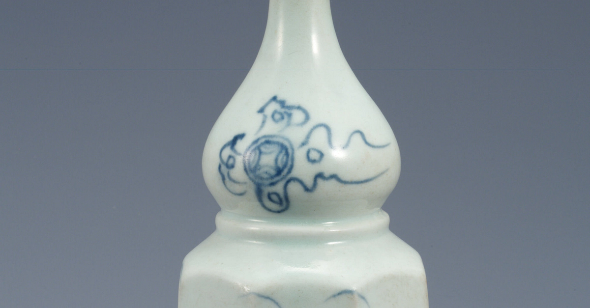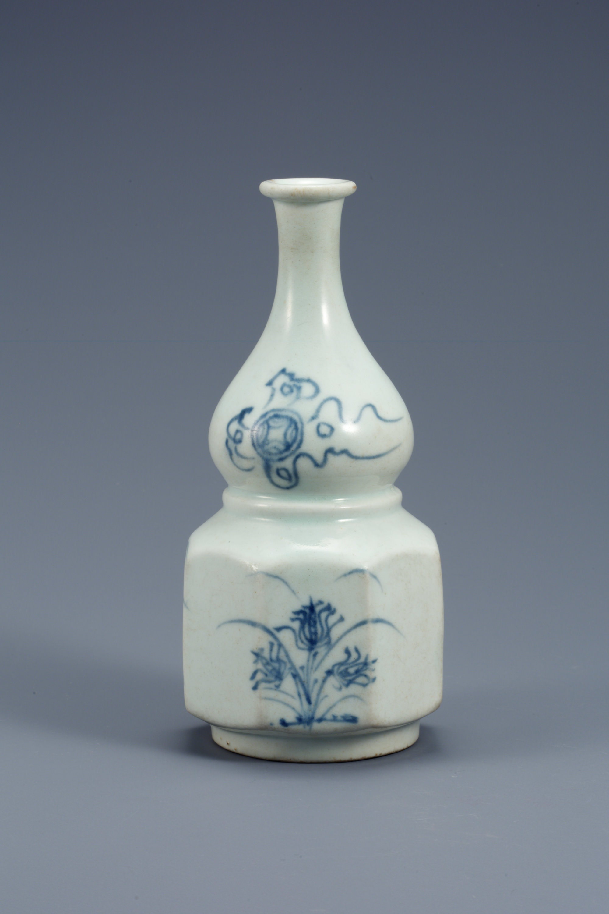 A bottle made from the white porcelain manufactured during the Joseon dynasty (1392-1910 CE) of Korea. The design has an auspicious character and orchids. (National Museum of Korea, Seoul, South Korea)