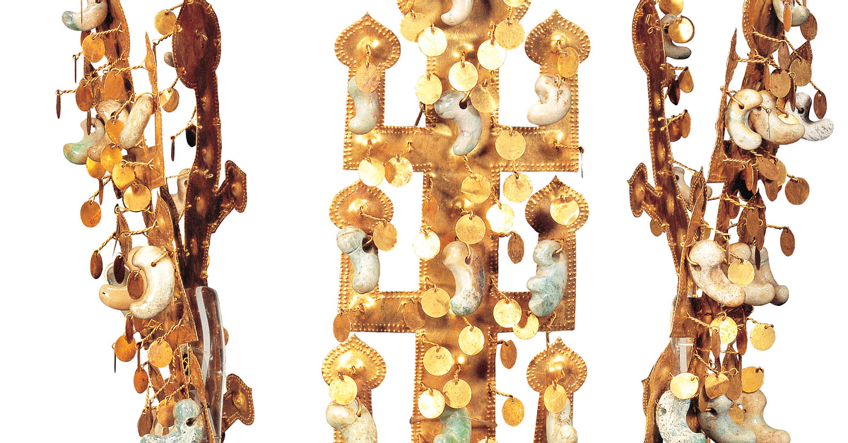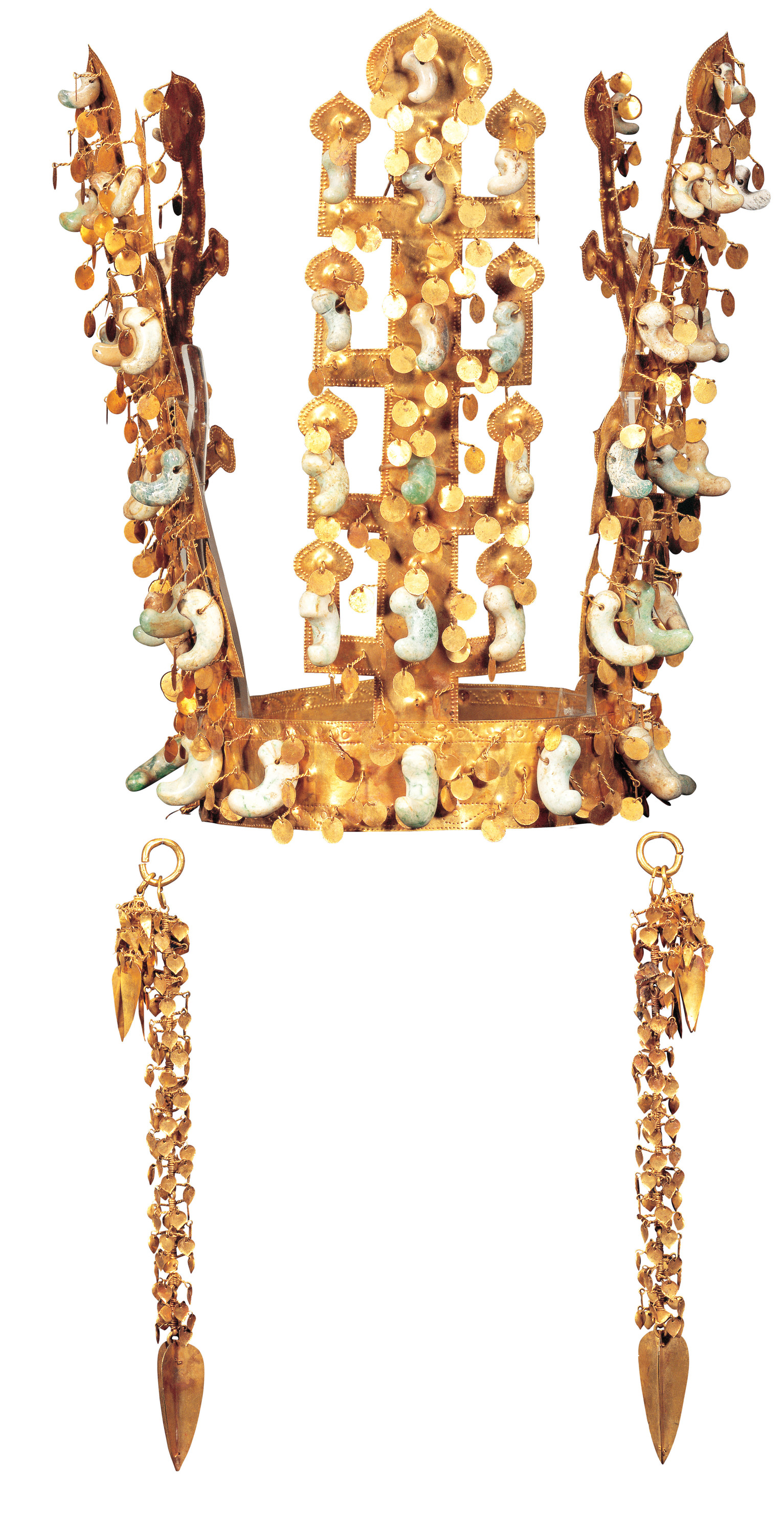 The gold crown from the Silla tomb Cheonmachong ('Heavenly Horse Tomb'), Gyeongju, Korea. 6th century CE, gold and jade. Height 32.5 cm. National Treasure No. 188. (Gyeongju National Museum)