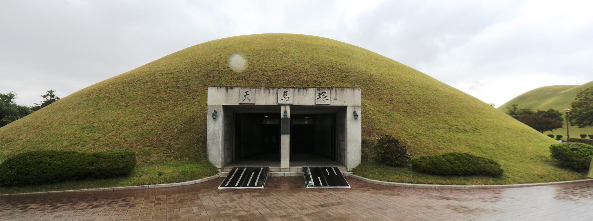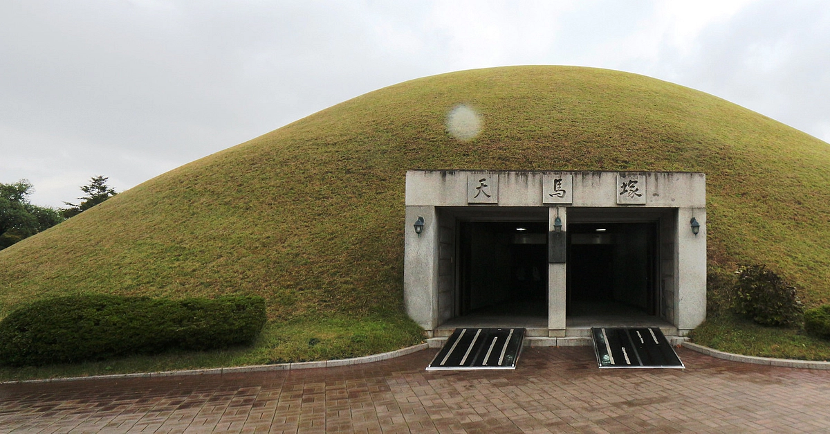 The Silla royal tomb Cheonmachong ('Heavenly Horse Tomb'), Gyeongju, Korea. 6th century CE. The tomb was excavated in 1973 CE and, amongst hundreds of other treasures, contained a coffin, gold crown, jewellery pieces, and a painted horse saddle showing a winged-horse.