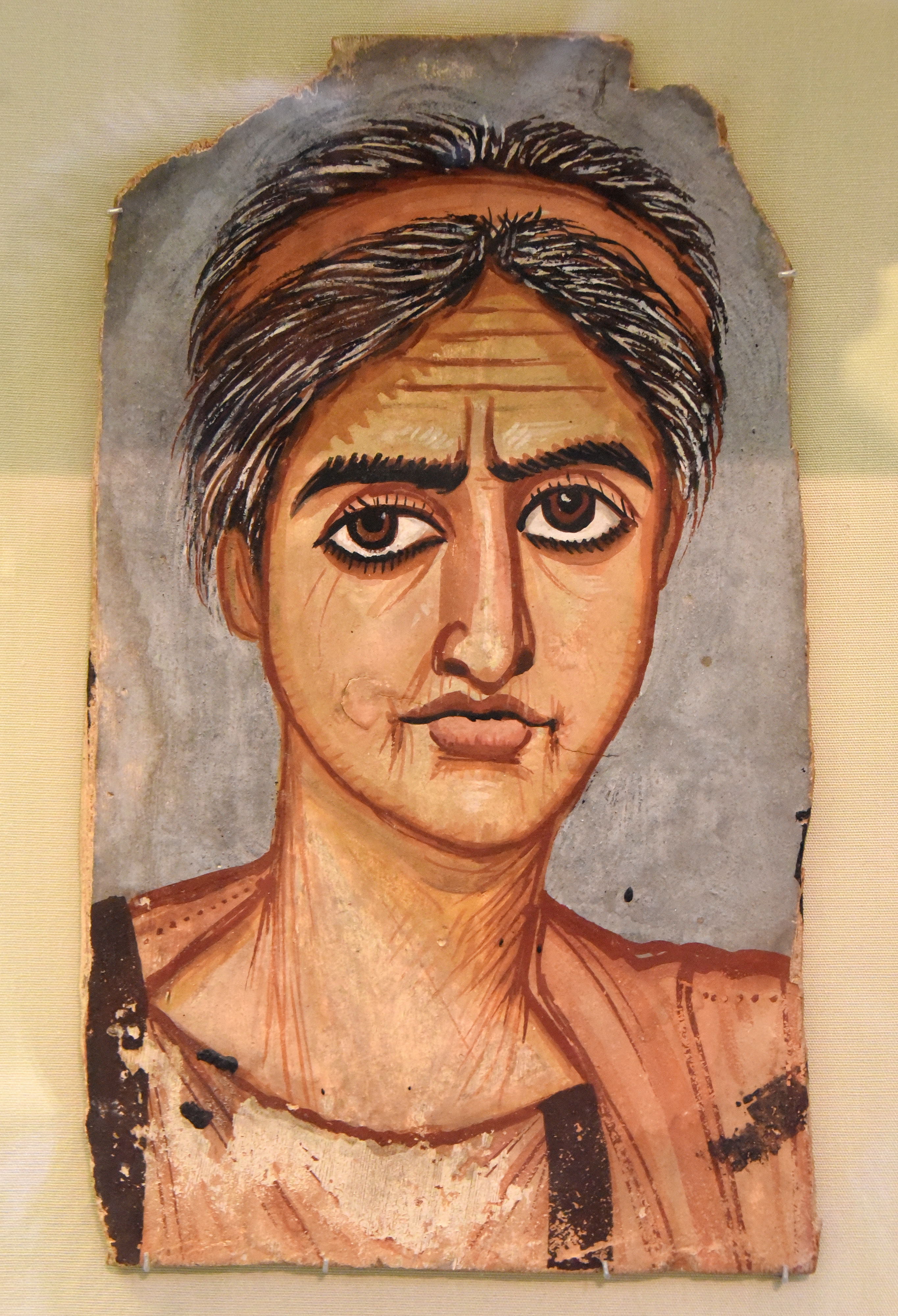 Mummy portrait of a woman painted in encaustic, a wax-based medium, on wood, from a tomb at Rubaiyat, Fayum, Egypt, about 300-325 CE.