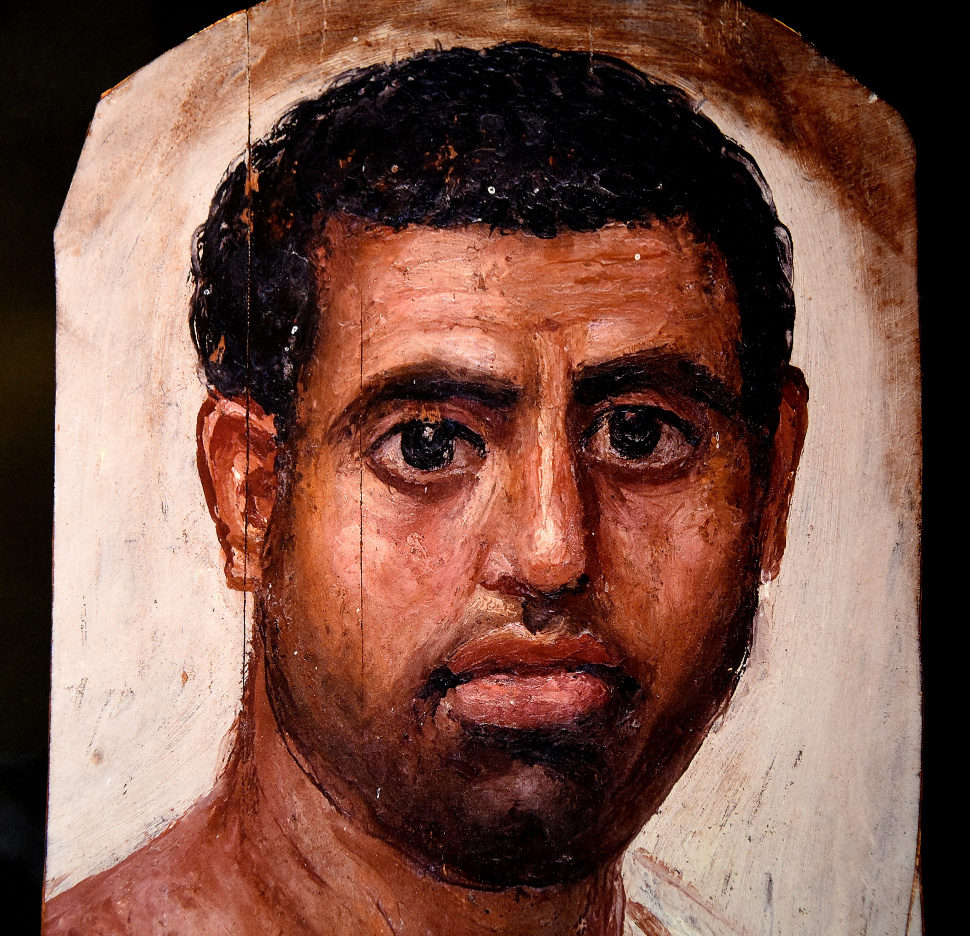 Mummy portrait of a man, painted in encaustic on limewood, from Hawara, Fayum, Egypt, 80-100 CE.