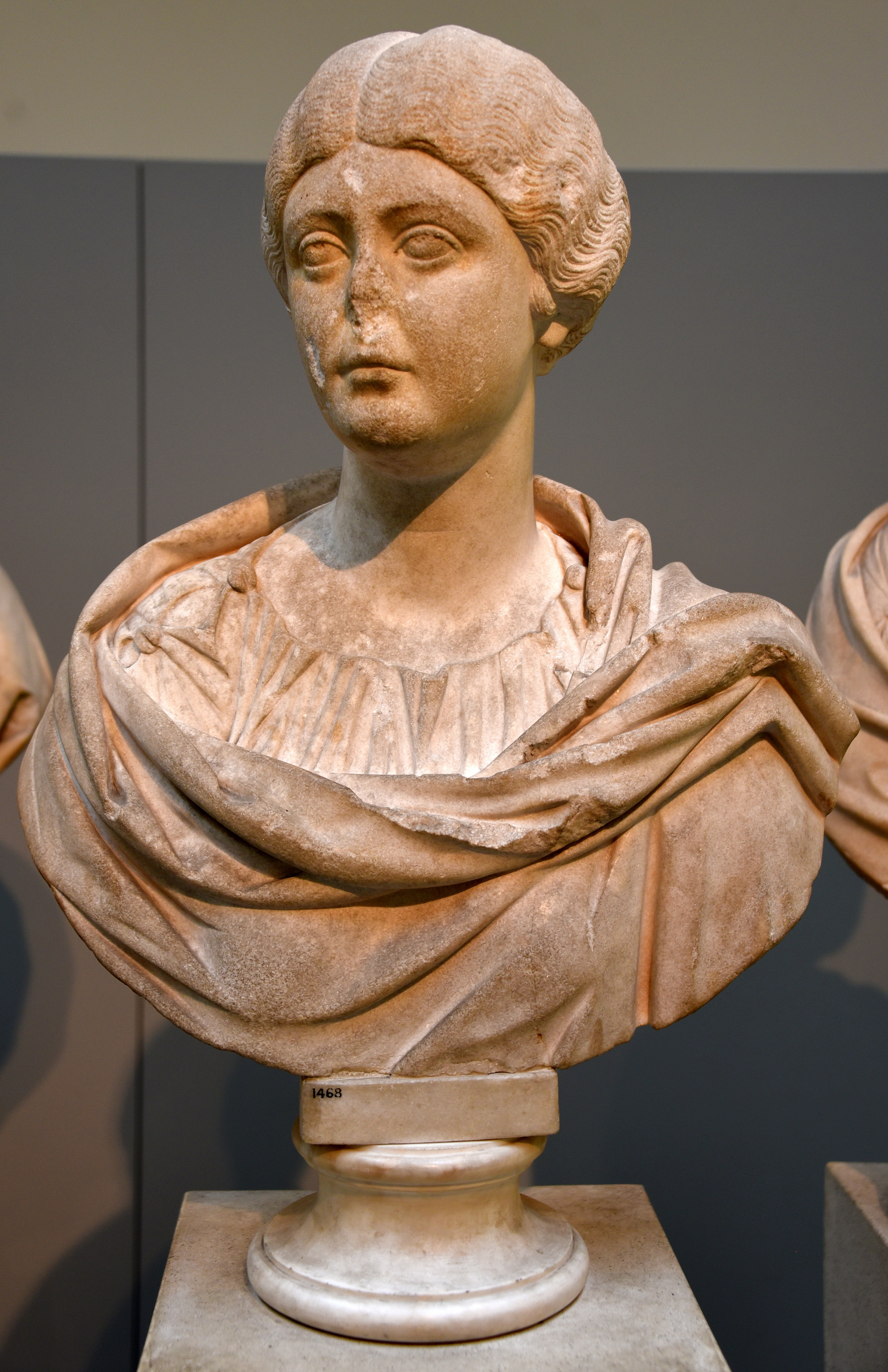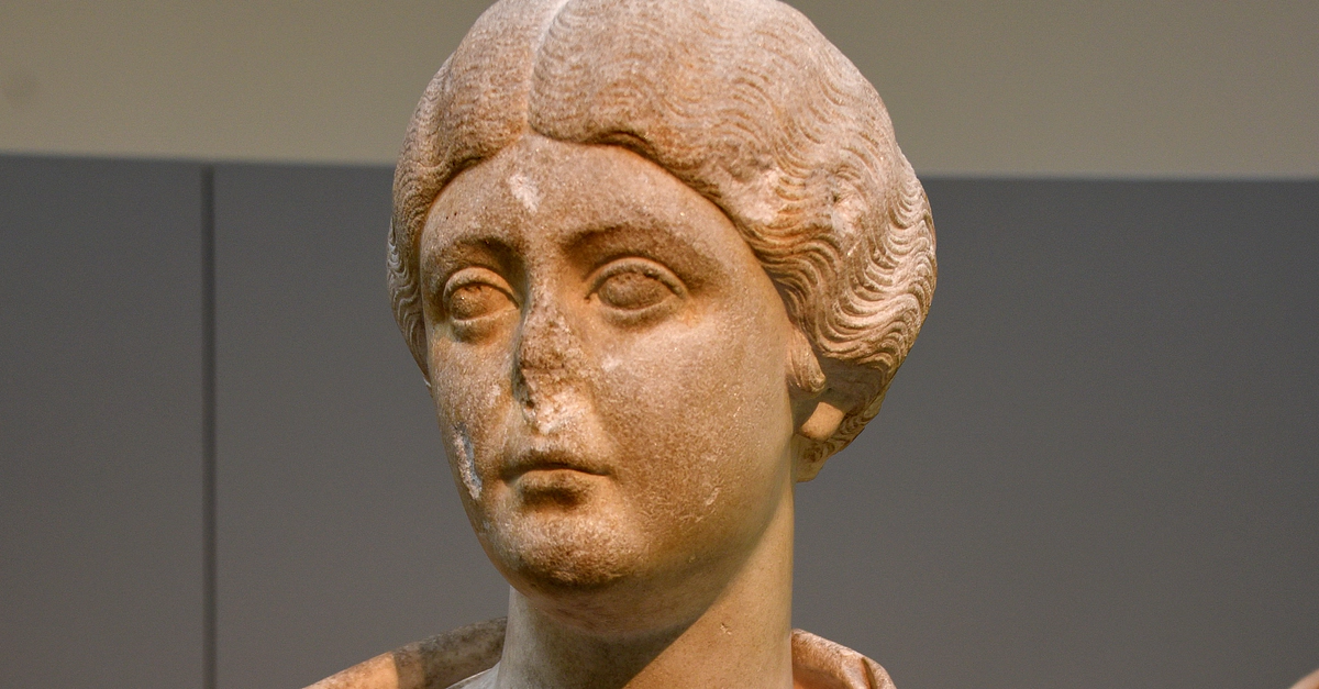 Marble bust of the younger Faustina (wife of Marcus Aurelius) or of her daughter, Lucilla (wife of Lucius Verus). One of a series of imperial portraits dedicated in the residence of Jason Magnus, a prominent citizen in Cyrene. Roman, 162-170 CE. From Cyrene, North Africa. Found by Lieutenant R. M. Smith, RE, and Commander E. A. Porcher, RN. (The British Museum, London).