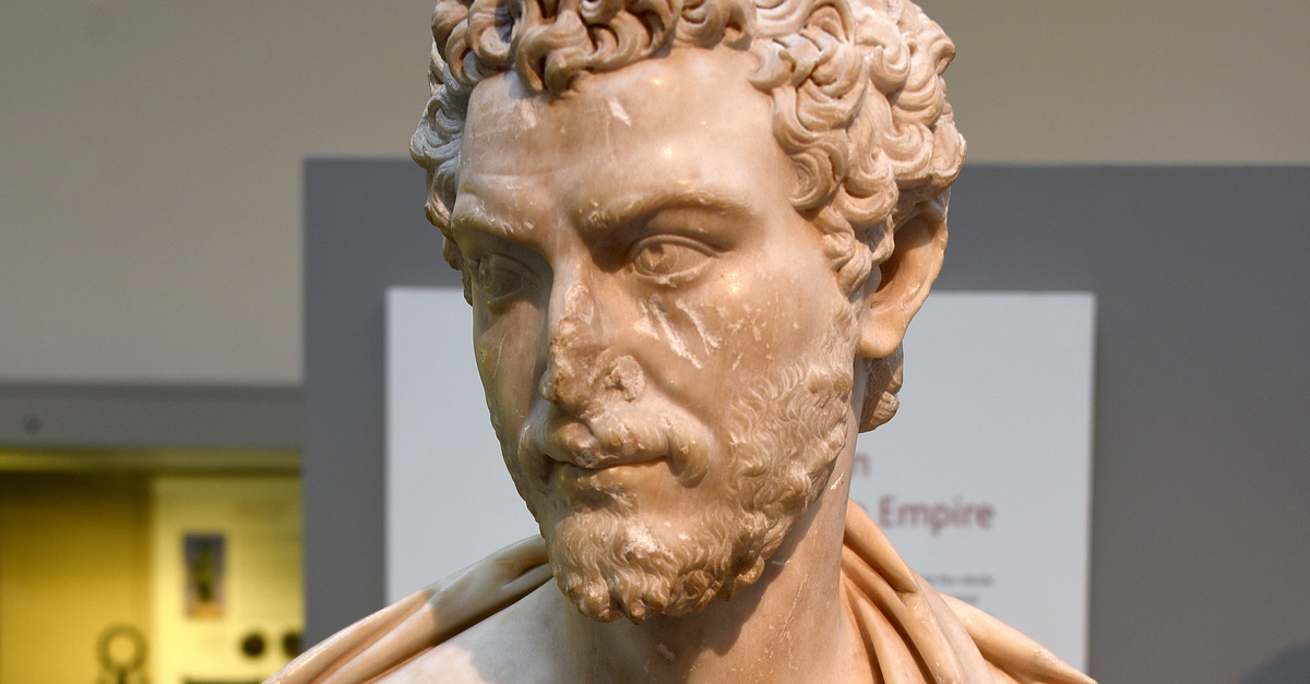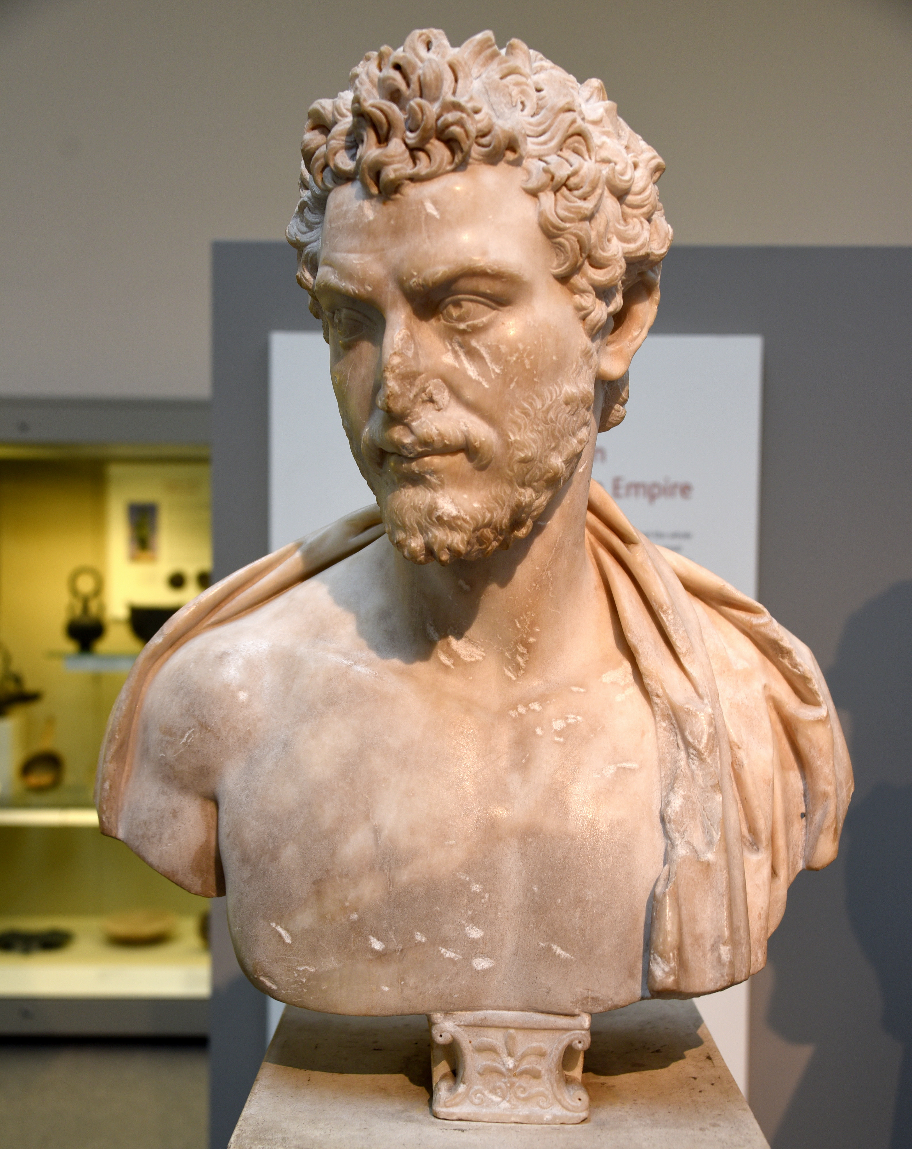 The man is dressed like Greeks of the Classical Period. His chest is bare and he has a heavy mantle draped over his shoulders This does not reflect the real fashion of his time, but is meant to lend him an air of Classical learning. Made about 160-170 CE. From Greece. From the Strangford Collection. (The British Museum, London).