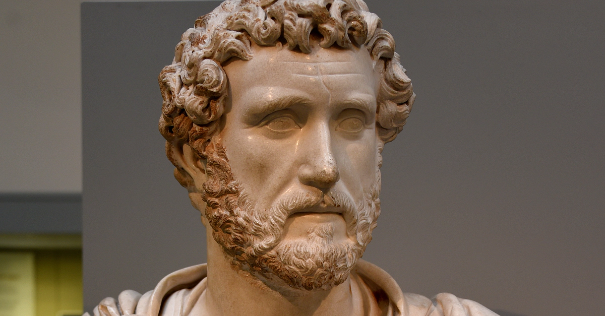 This is a marble bust of the Roman Emperor Antoninus Pius (reigned 138-161 CE). The Emperor wears military dress. This image of Antoninus Pius was created in the early years of his reign. The bust may be a replica made in the 160s CE. Roman, circa 140 CE. From the house of Jason Magnus at Cyrene, North Africa. Found by Lieutenant R. M. Smith, RE, and Commander E. A. Porcher, RN. (The British Museum, London).