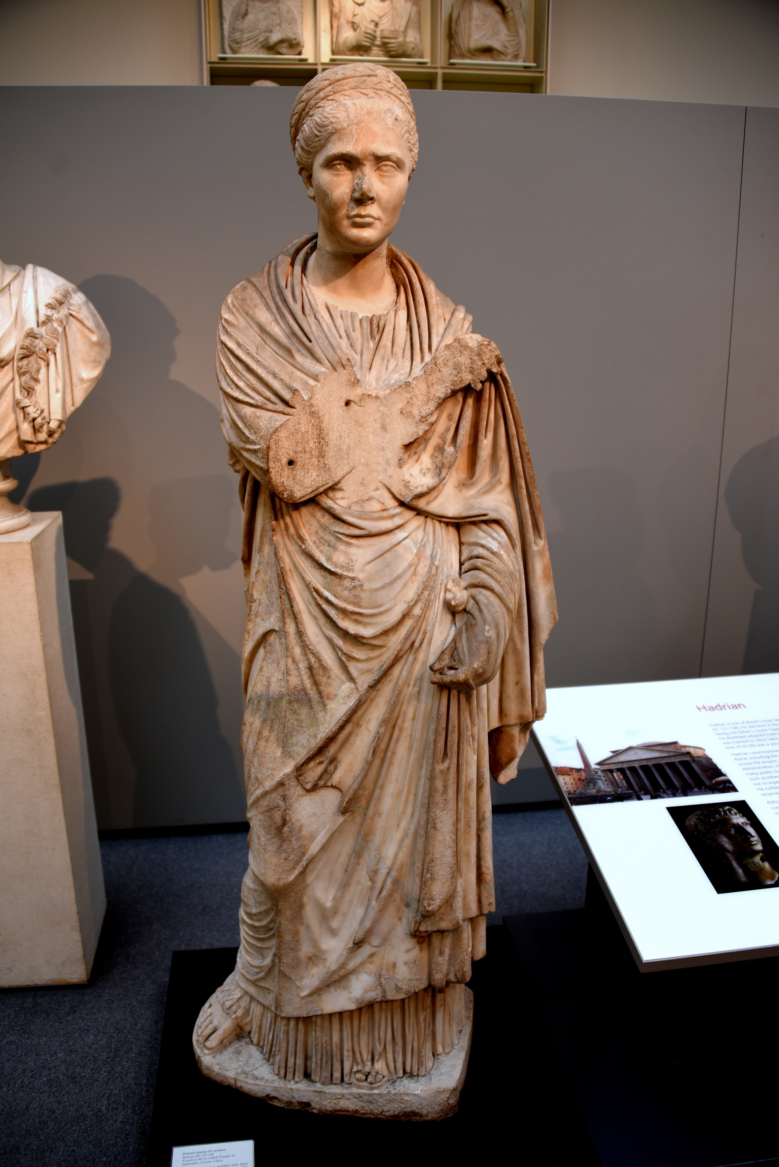 The statue sows a wealthy lady from the latter part of Hadrian's reign. The body is Pentelic marble from Athens, Greece but the head is of a finer marble from the Greek island of Paros. Emperor Hadrian rebuilt Cyrene after the Jewish revolt of 115-116 CE. He restored the major buildings, including the temple of Apollo and even brought settlers from Turkey to re-populate the city. Roman, 130-140 CE. Found in the co-called Temple of Aphrodite, Cyrene, Libya. Excavated by R. M. Smith and E. A. Porcher. (The British Museum, London).