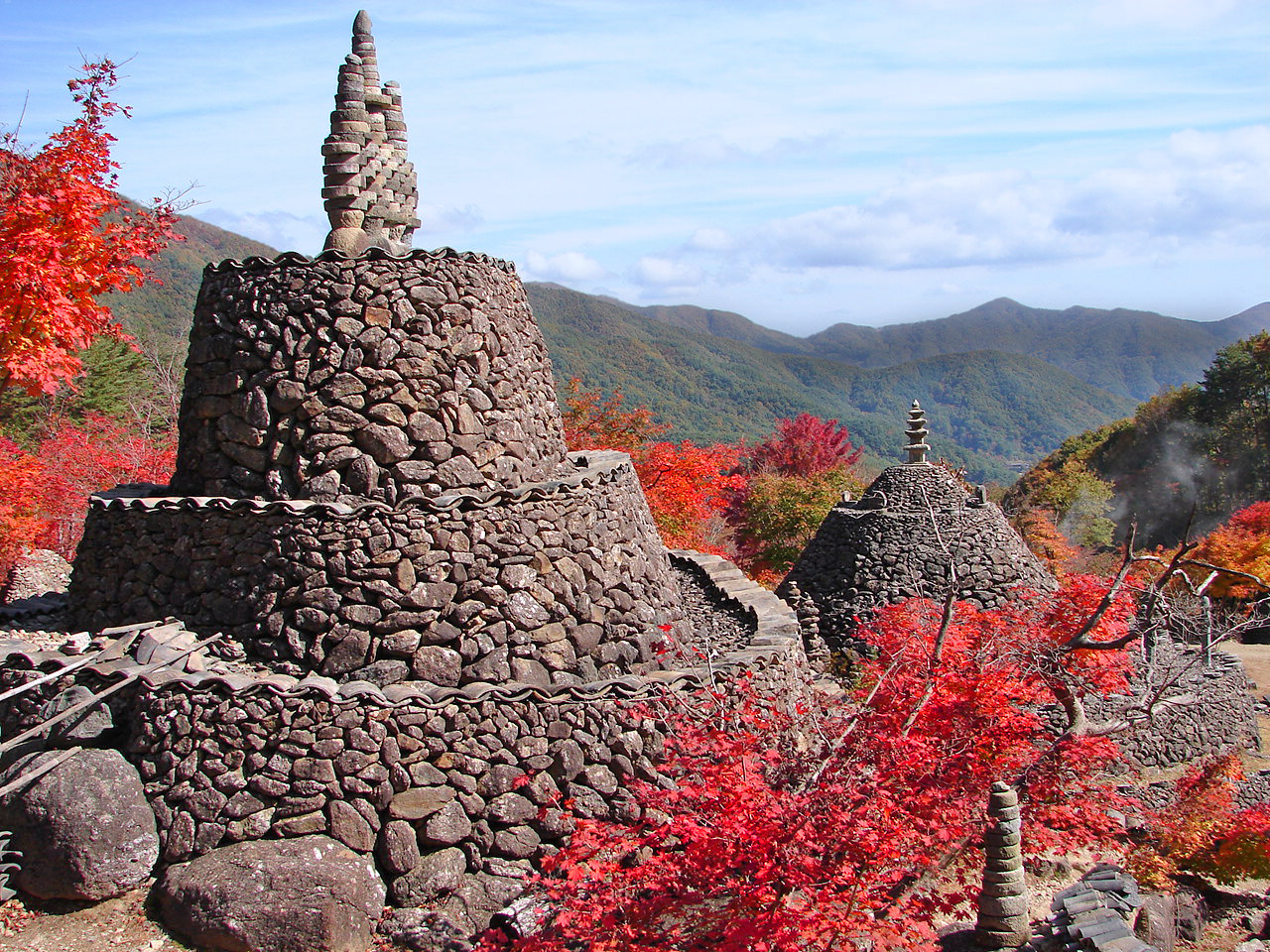 Bangsadaps, stone mounds built to ward off evil spirits at the Samseonggung Shrine, South Gyeongsang Province, Korea.