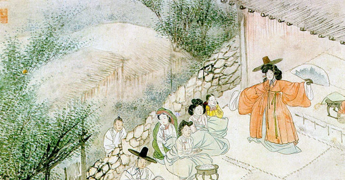 An early 19th century CE print by Shin Yun-bok depicting a Korean female shaman, a mudang, performing a kut, a ritual to contact spirits. Shamans practised from prehistoric times in Korea.