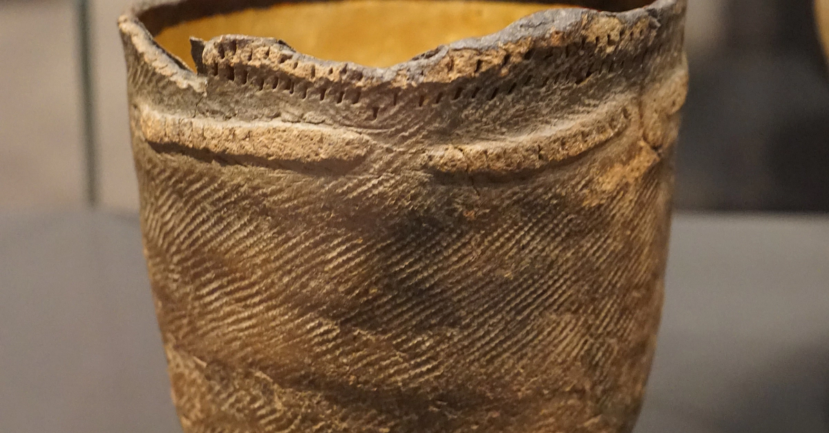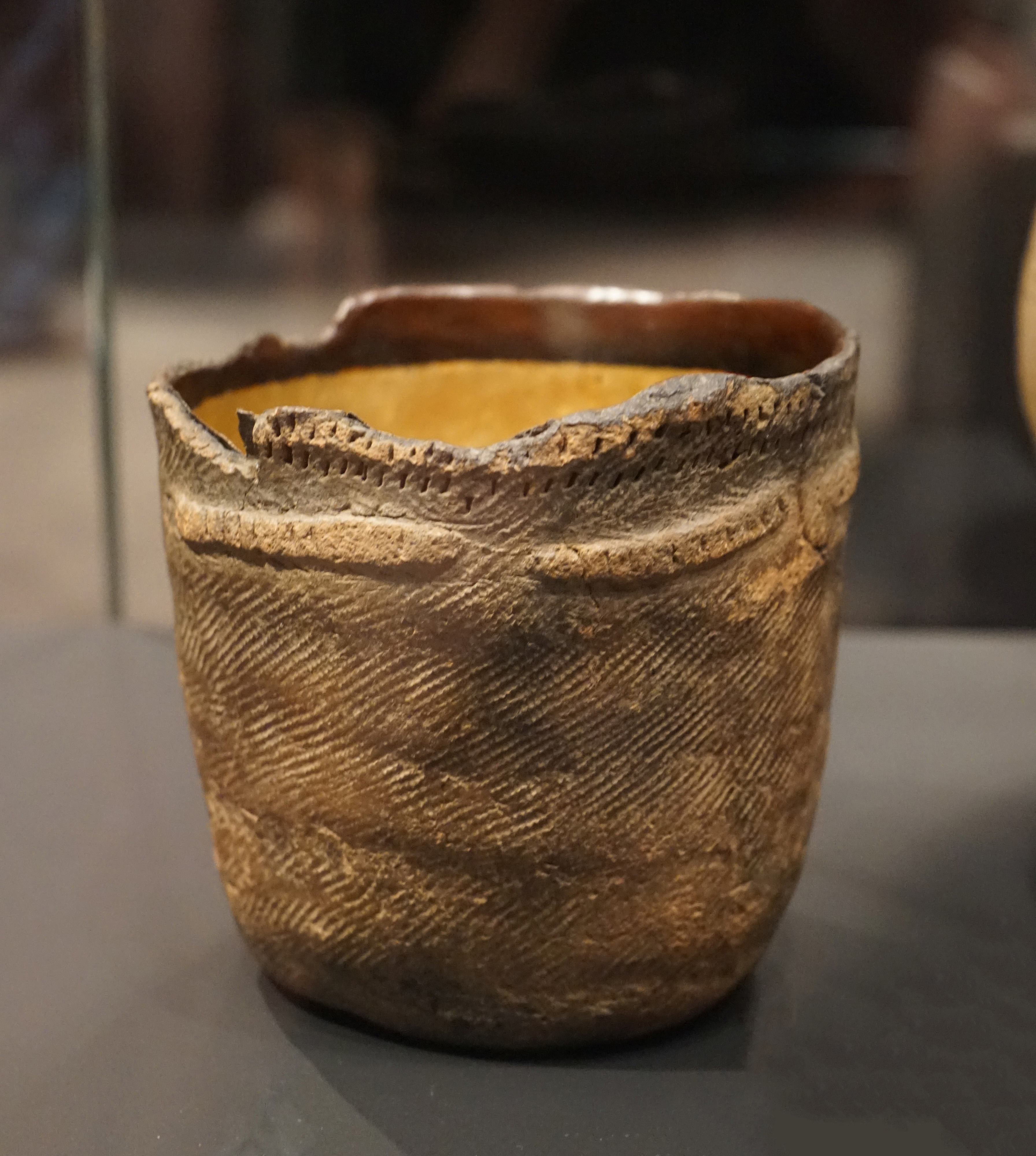 This Jomon clay pot was found in Japan (5000 BCE). It was lacquered on the inside with gold in the 1800's when it became a water jar at Japanese tea gatherings. This image was taken at the National Museum of Australia in the travelling exhibition A History of the World in 100 (and 1) Objects.