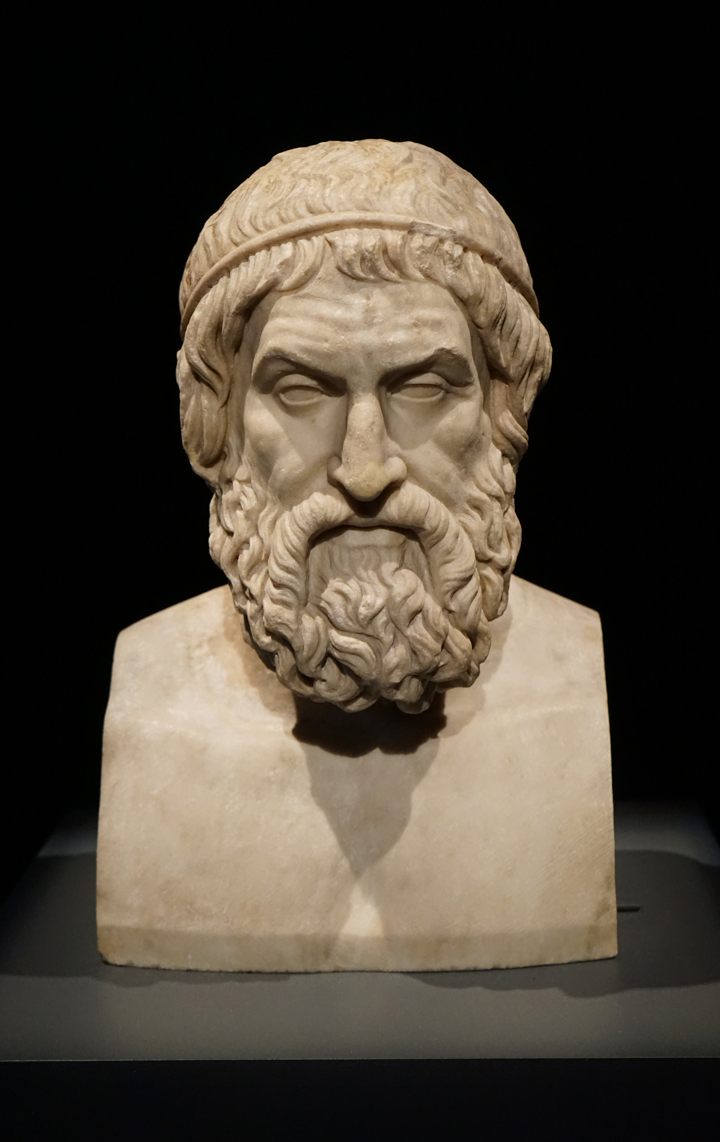 This bust of Sophocles is made from marble and from Lazio, Italy (150 CE). Sophocles was a Greek playwright who wrote tragedies in the 5th century BCE. This image was taken at the National Museum of Australia in the travelling exhibition A History of the World in 100 (and 1) Objects.