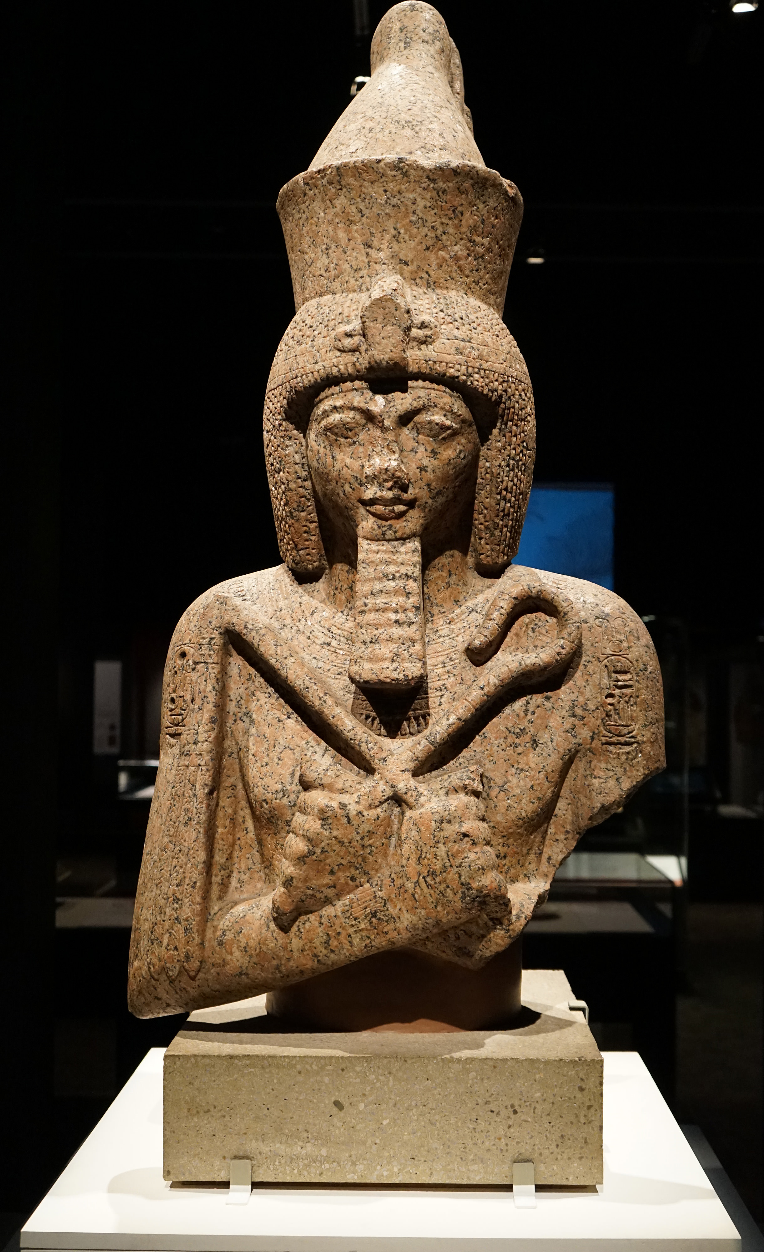 This granite statue of Ramesses II was discovered at the Temple of Khnum, Elephantine, Egypt (1280 BCE). Ramesses II was a very successful ruler between around 1279-1213 BCE. Here he holds a crook and flail and wears a double crown, symbolising his power over Upper and Lower Egypt. This image was taken at the National Museum of Australia in the travelling exhibition A History of the World in 100 (and 1) Objects.