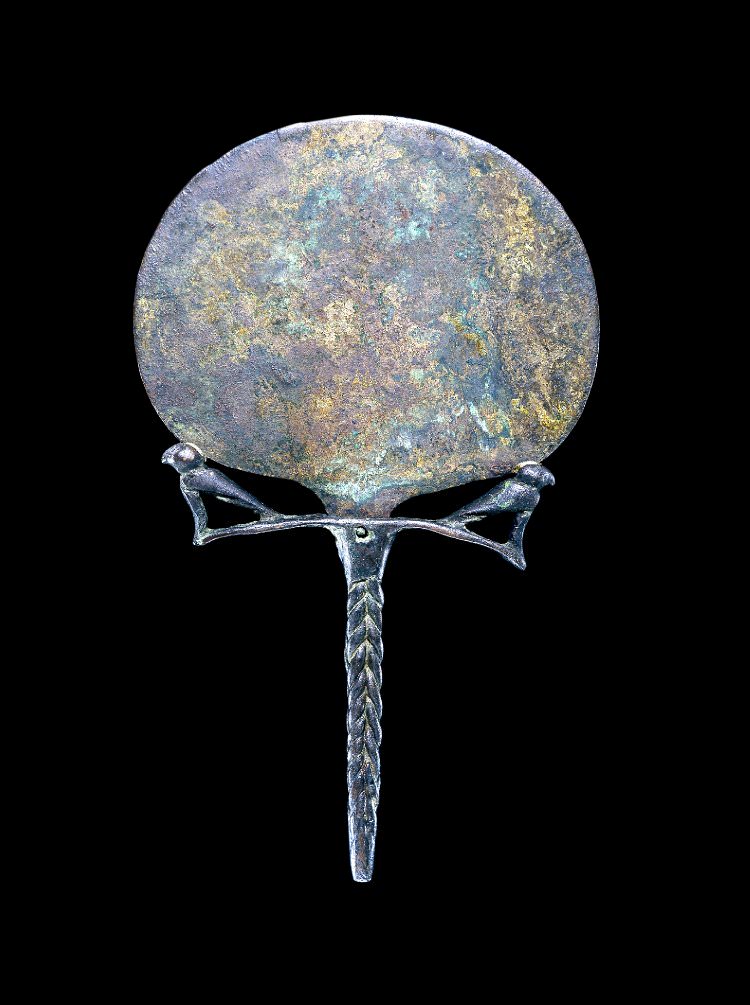 Bronze mirror from the Middle Kingdom of Egypt with a handle surmounted by two falcons.