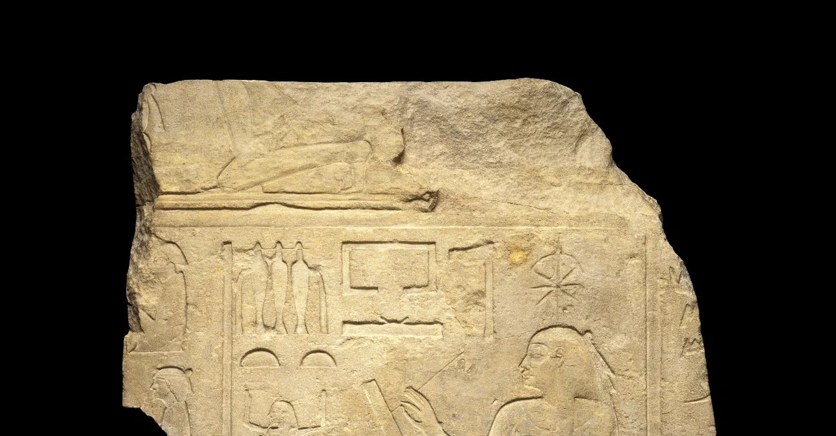 A limestone relief slab depicting Seshat, the Egyptian goddess of writing. ca. 1919-1875 BCE. (Brooklyn Museum, USA).