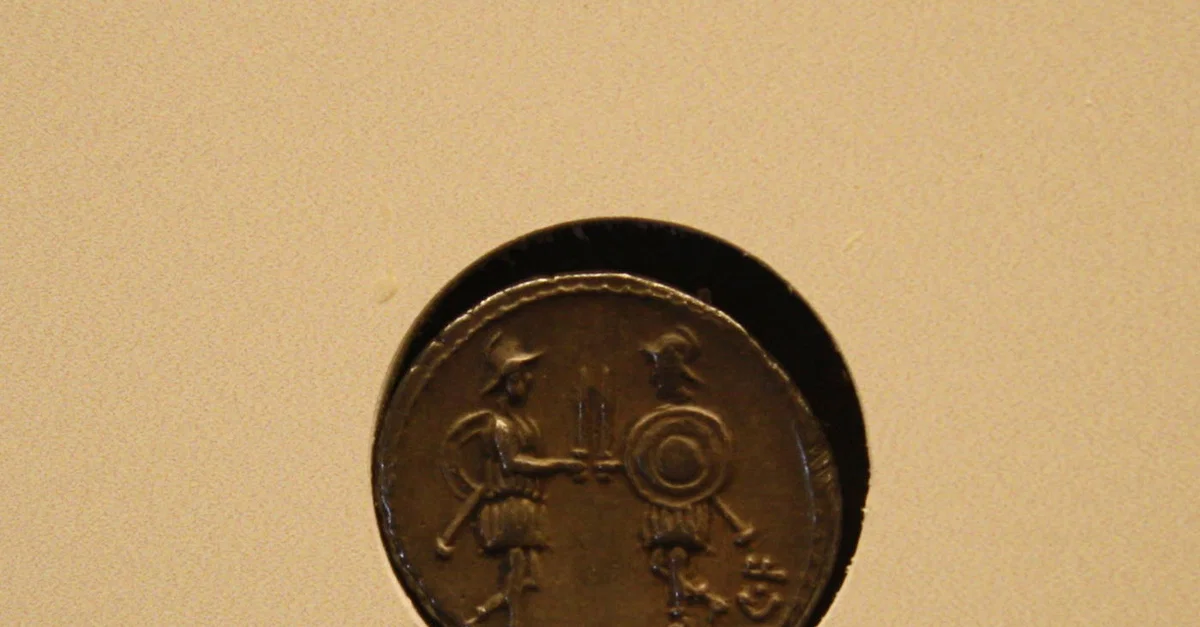 A Roman coin depicting two standing soldiers. Denarius of Caius Servilius, 1st century BCE. (Archaeological Museum, Tarragona, Spain)